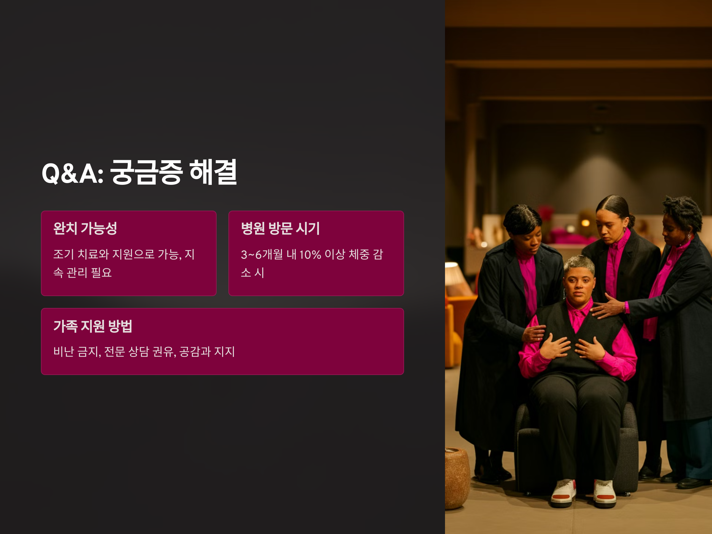 신경성 식욕부진은 조기에 발견하고 치료하면 회복이 가능합니다. 체중 급감이 지속된다면 즉시 전문가와 상담하여 적절한 조치를 취하는 것이 중요합니다.