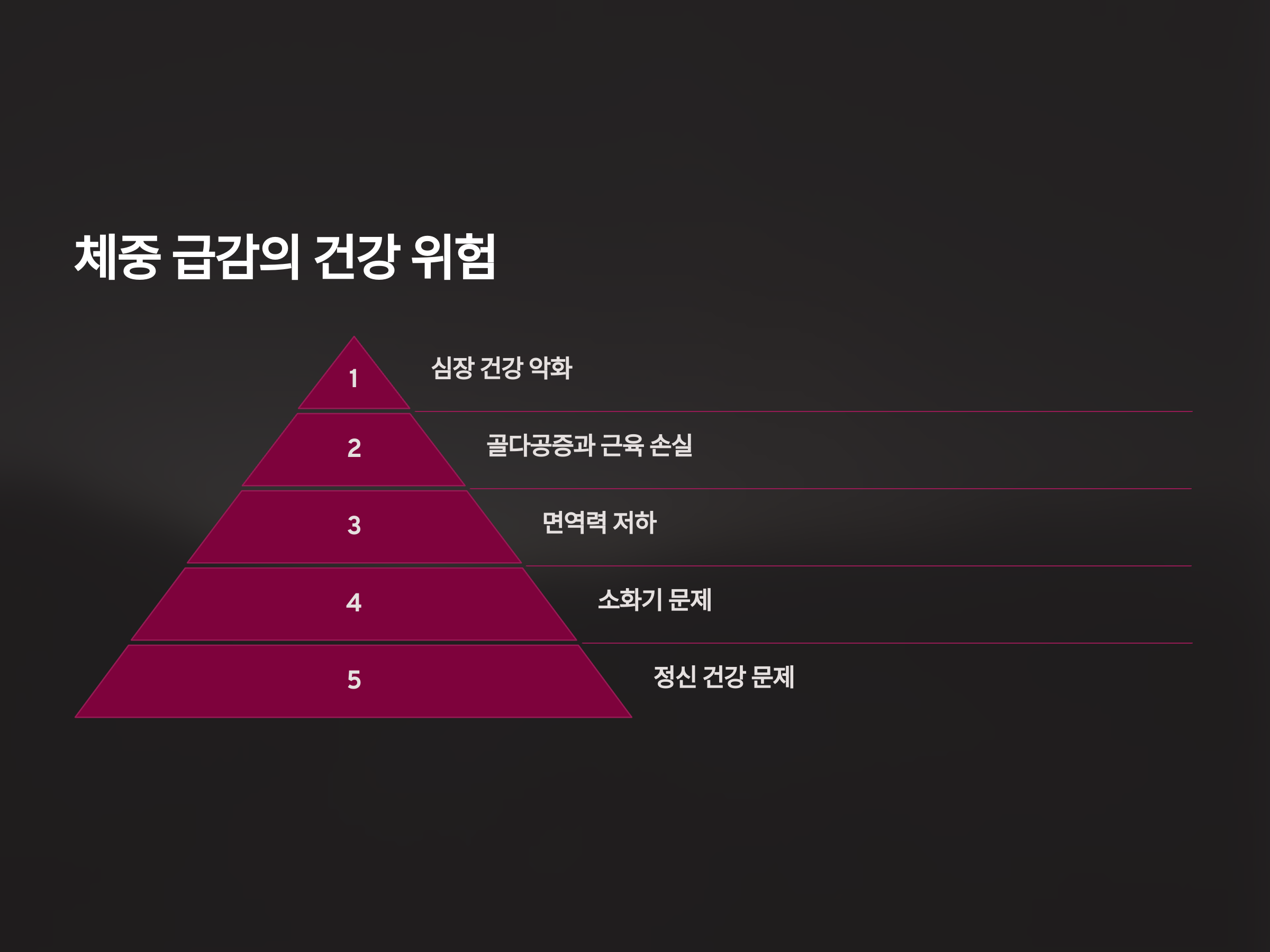 체중이 급격하게 감소하면 우리 몸의 정상적인 기능이 위협받을 수 있습니다. 체중 급감으로 인한 대표적인 건강 문제는 다음과 같습니다.