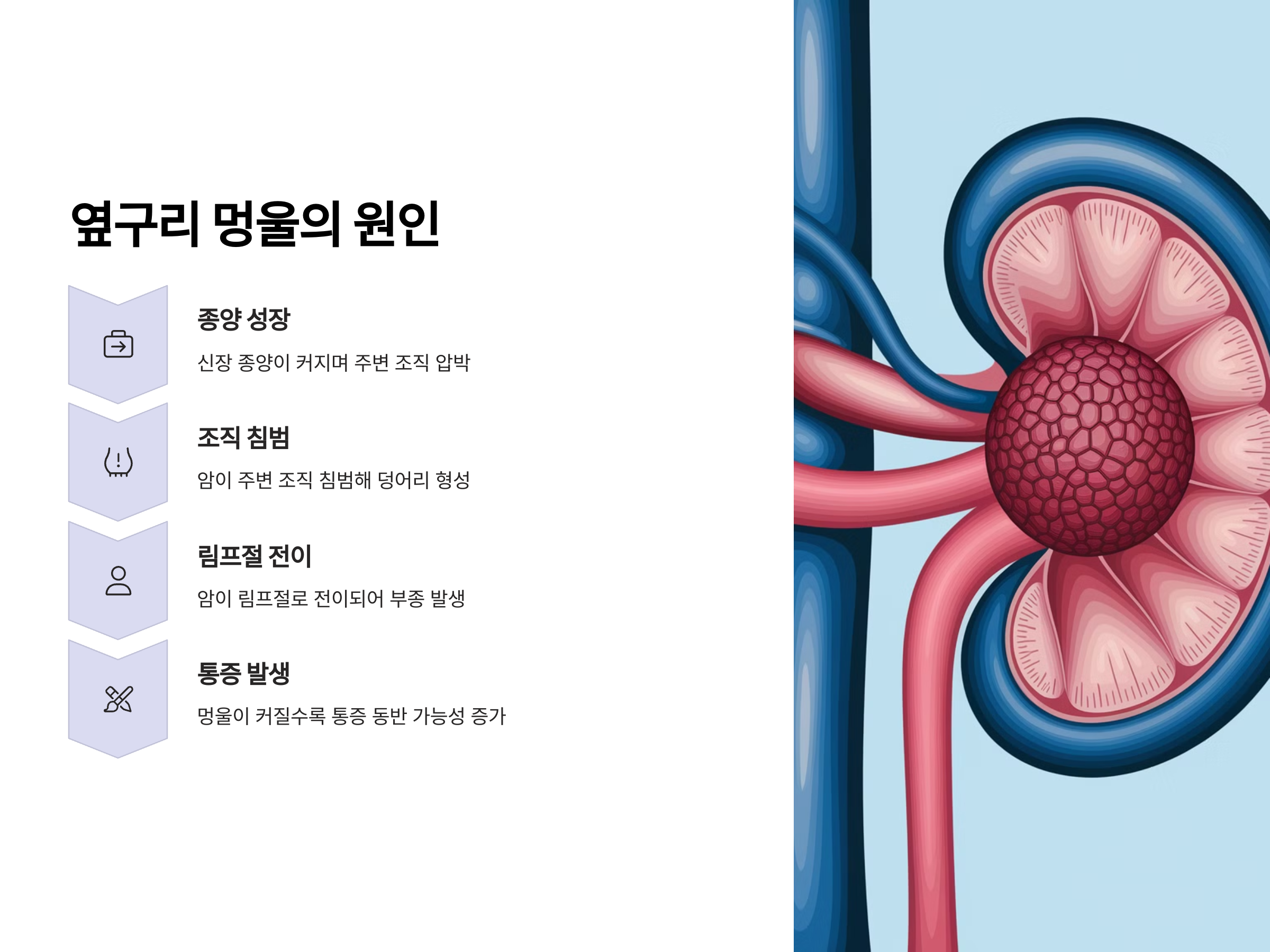 옆구리에 멍울이 생기는 원인은 신장암이 신장과 주변 조직을 침범하기 때문입니다. 신장의 종양이 커지면서 주변 조직이나 장기를 압박하고, 이로 인해 덩어리가 만져질 수 있습니다. 암이 더 커지면 옆구리나 배 부위에 통증을 유발할 수 있으며, 이로 인해 멍울이 생길 수 있습니다. 또한, 신장암이 림프절이나 다른 기관으로 전이되면 이로 인해 부종이나 멍울이 발생할 수 있습니다.