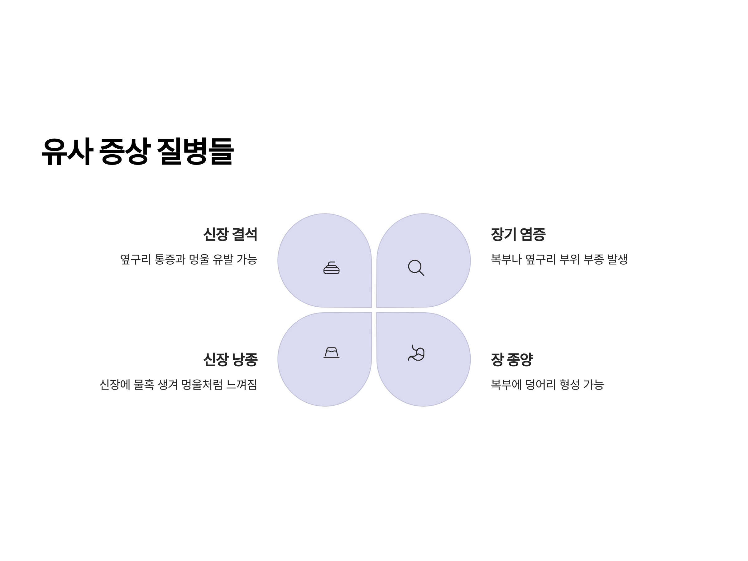 옆구리 멍울이 반드시 신장암을 의미하는 것은 아닙니다. 실제로 여러 다른 질병들이 이와 비슷한 증상을 나타낼 수 있습니다. 예를 들어, 신장 결석, 복부 또는 장기의 염증, 장의 종양, 신장 낭종 등이 옆구리나 복부에 멍울을 유발할 수 있습니다. 이들 질병은 신장암과 증상이 유사할 수 있기 때문에, 멍울이 느껴진다면 반드시 정확한 진단을 받는 것이 중요합니다.