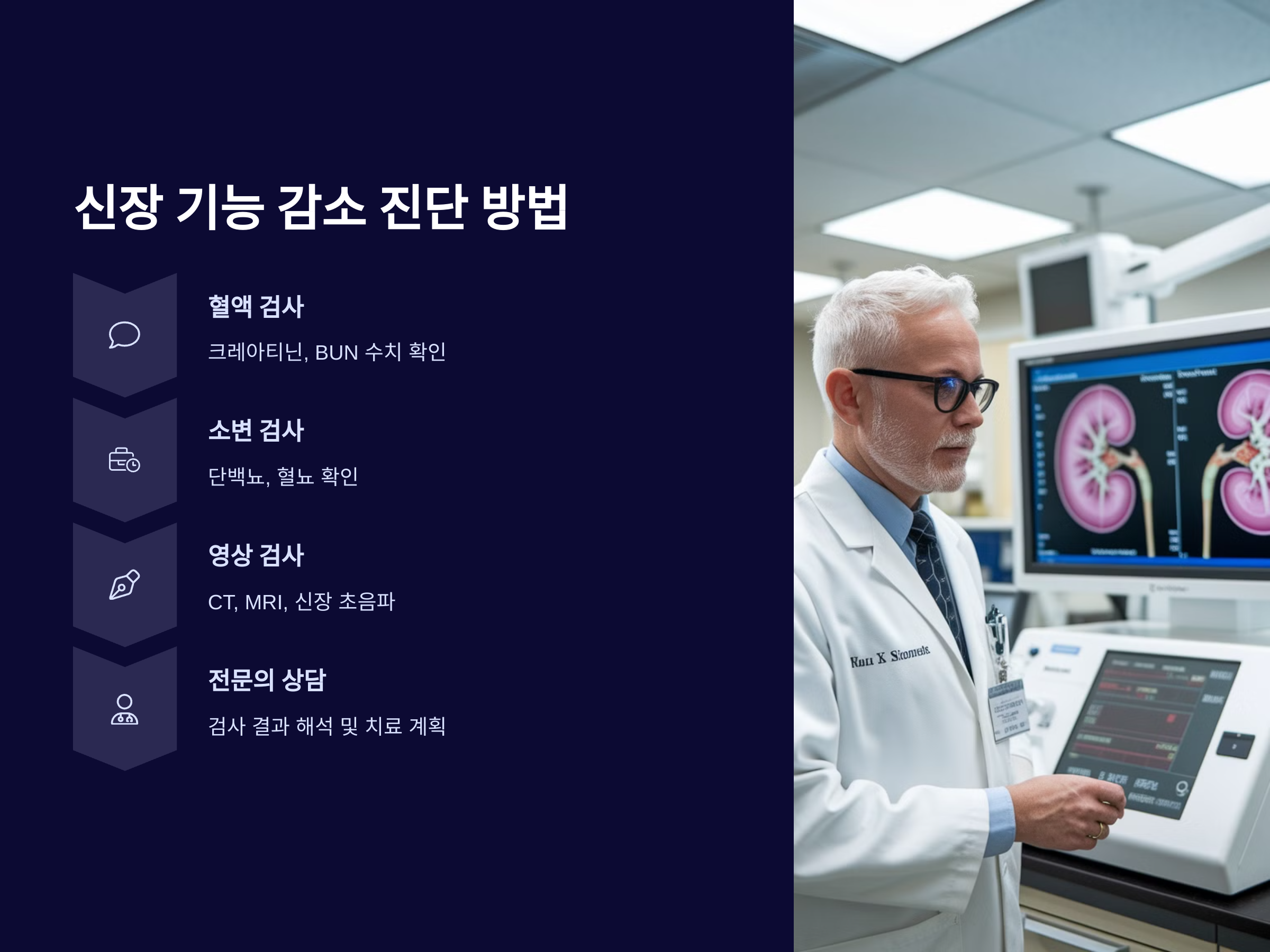 CT, MRI, 신장 초음파와 같은 영상 검사는 신장 크기, 모양 및 구조를 확인하는 데 유용합니다. 이러한 검사들은 신장 질환을 조기에 진단하고, 적절한 치료 방법을 결정하는 데 도움을 줍니다.