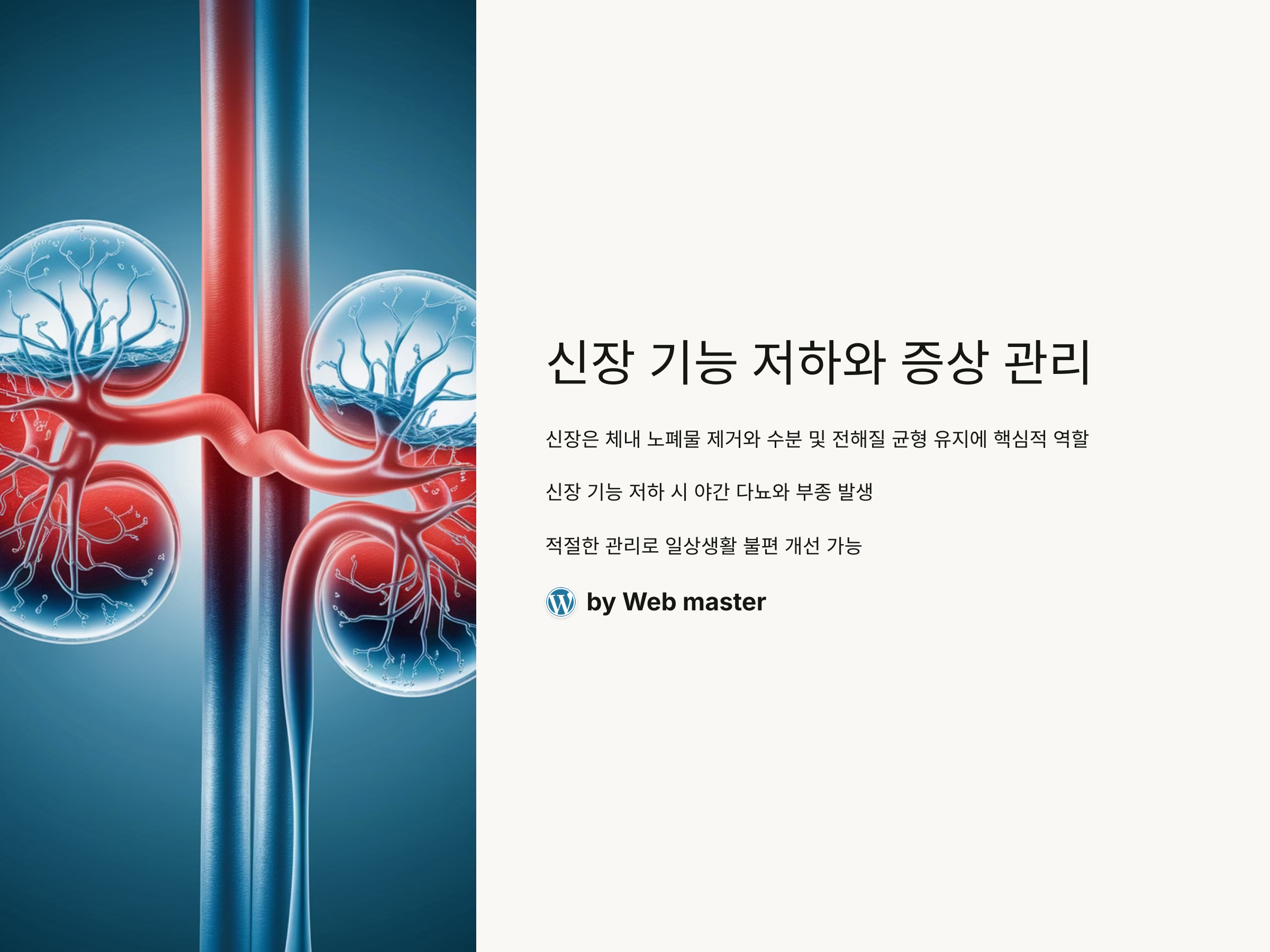 신장은 체내 노폐물 제거와 수분 및 전해질 균형 유지에 핵심적인 역할을 합니다. 그러나 다양한 요인으로 신장 기능이 저하되면 야간 다뇨와 부종과 같은 증상이 나타날 수 있습니다. 이러한 증상들은 일상생활에 불편을 주며, 적절한 관리가 필요합니다. 이번 글에서는 신장 기능 저하로 인한 야간 다뇨와 부종의 원인, 증상, 그리고 효과적인 관리 방법에 대해 자세히 알아보겠습니다.