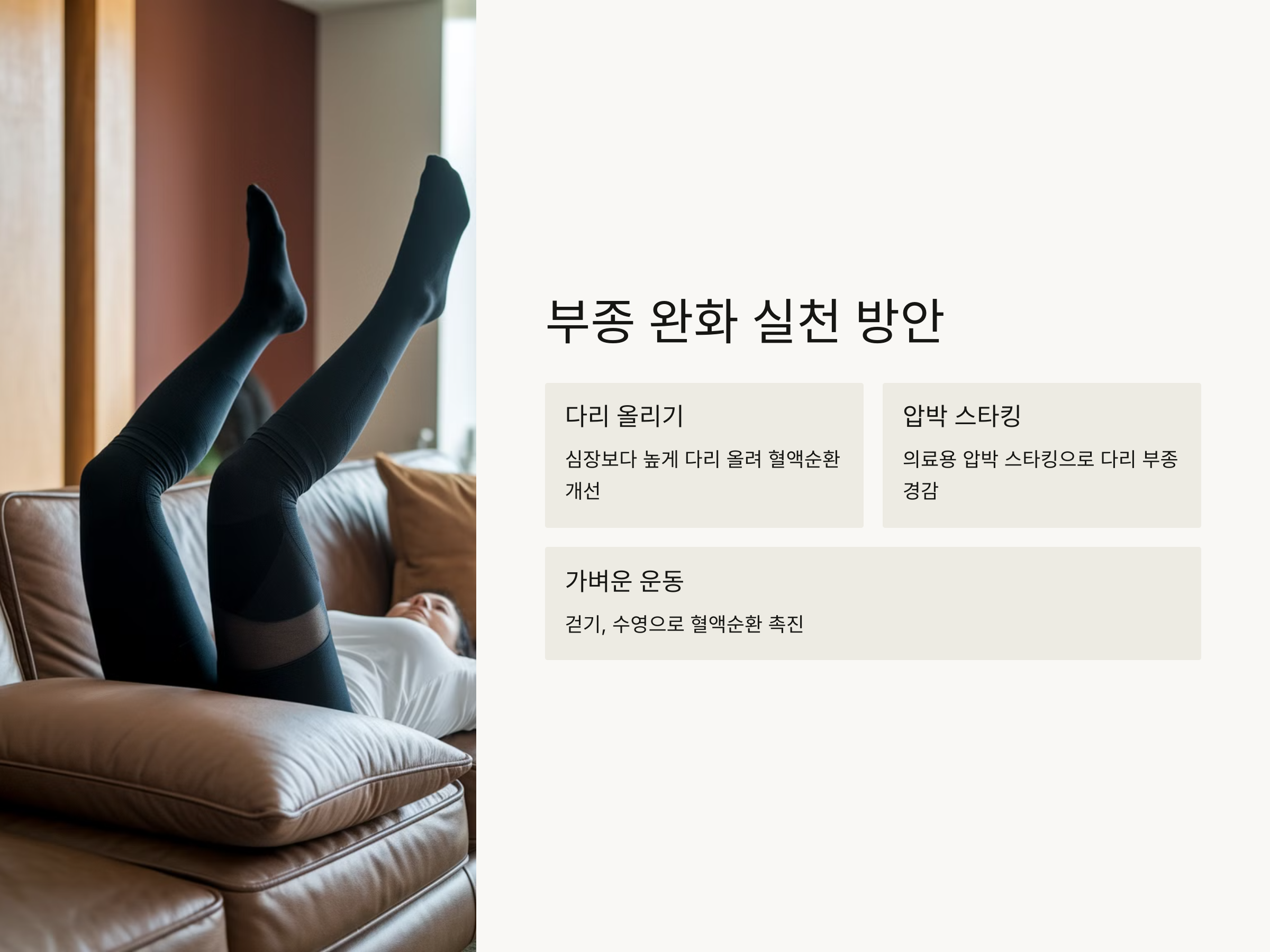 - 다리 올리기: 하루 중 일정 시간 다리를 심장보다 높게 올려 부종을 완화합니다.