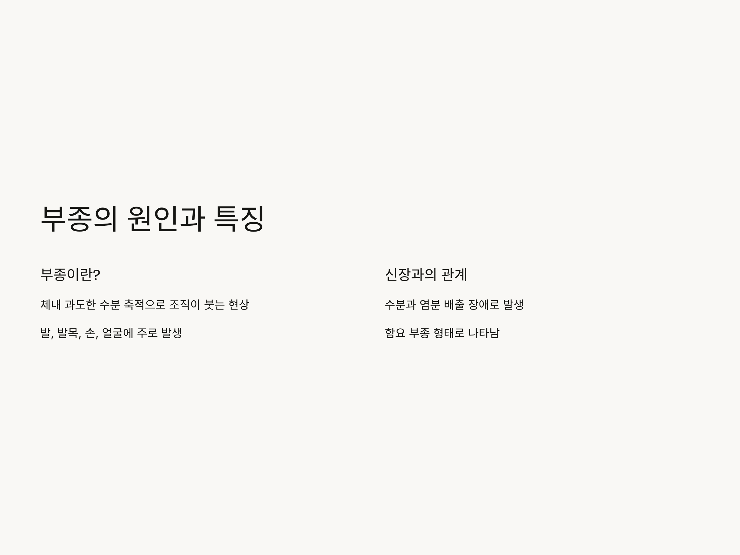 부종(edema)은 체내에 과도한 수분이 축적되어 조직이 붓는 현상을 말합니다. 이는 주로 발, 발목, 손, 얼굴 등에서 나타나며, 특히 아침 시간대에 두드러지게 나타날 수 있습니다.