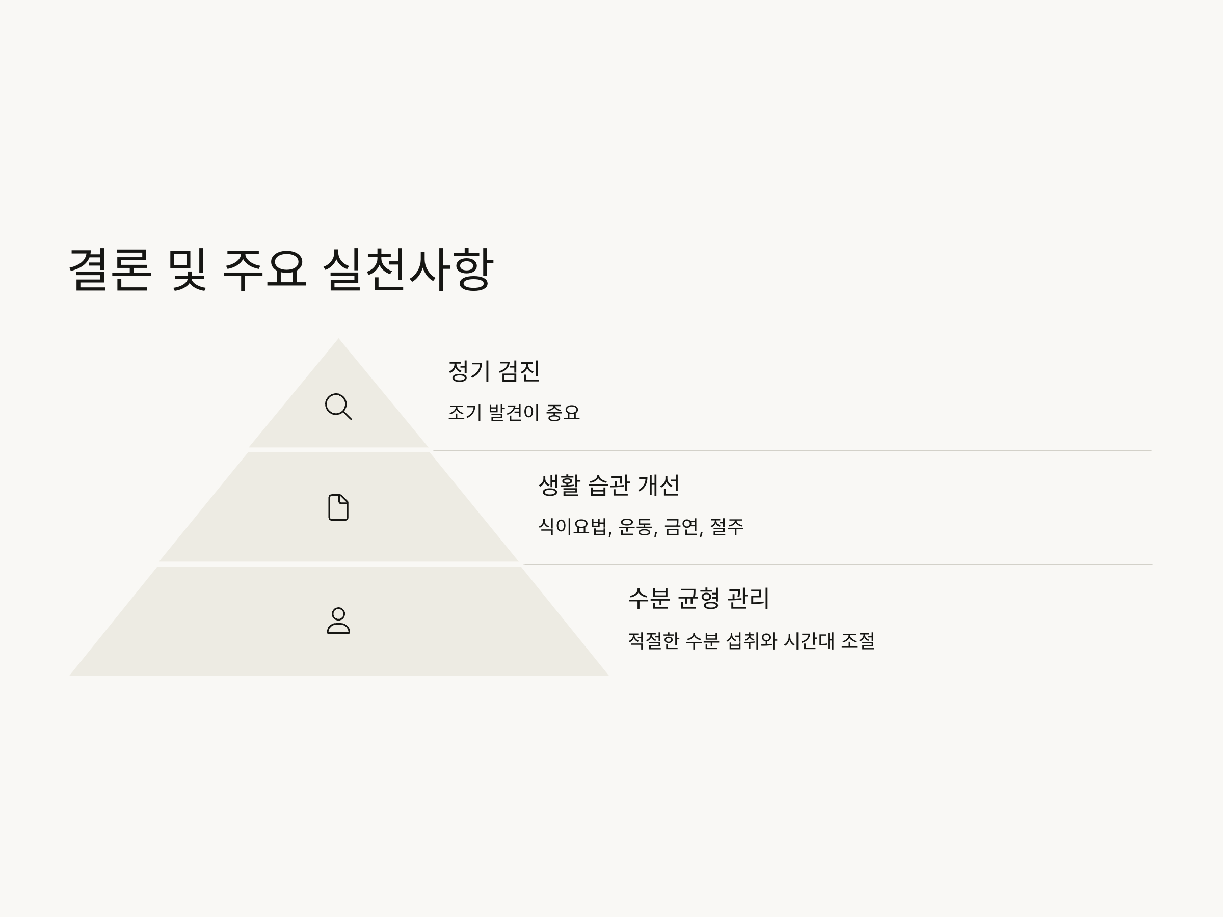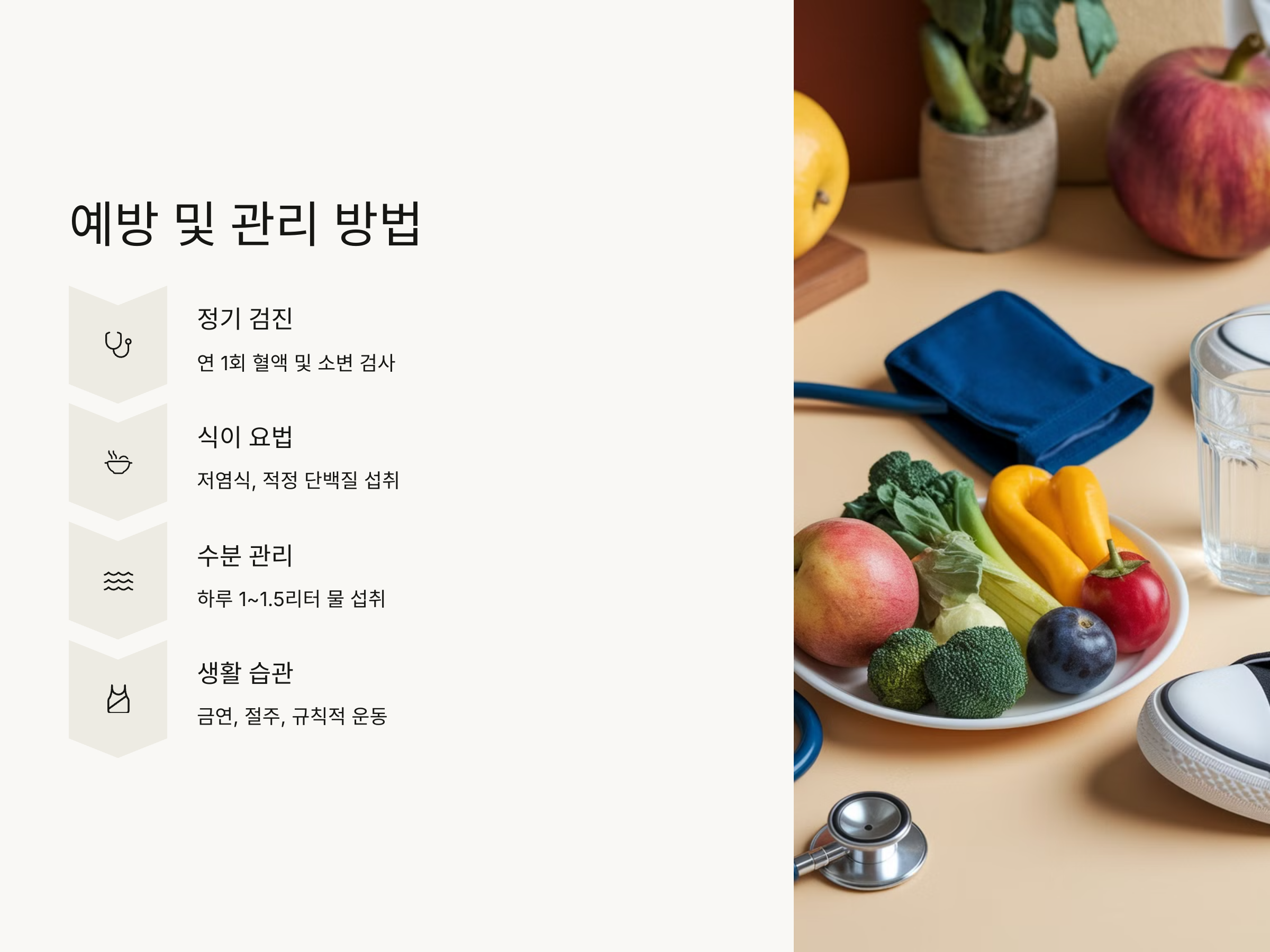 - 적절한 수분 섭취: 하루 1~1.5리터의 물을 섭취하여 신장 기능을 지원합니다.