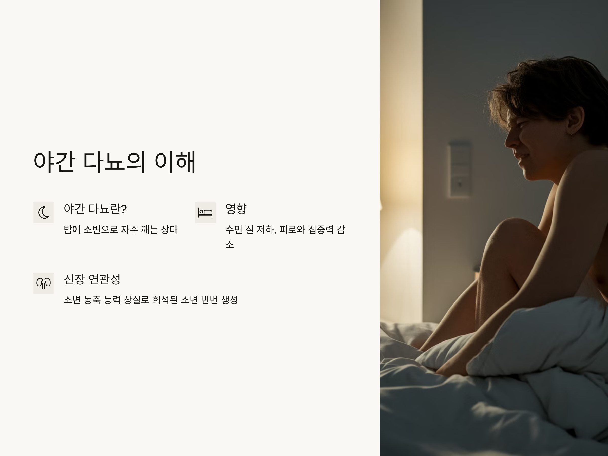 야간 다뇨(Nocturia)는 밤 시간 동안 소변을 보기 위해 자주 깨어나는 상태를 의미합니다. 일반적으로 성인은 밤에 한두 번 정도 화장실을 가는 것이 정상으로 간주되지만, 그 이상 빈번하게 발생한다면 야간 다뇨를 의심해볼 수 있습니다. 이는 수면의 질을 저하시켜 피로와 집중력 감소를 유발할 수 있습니다.