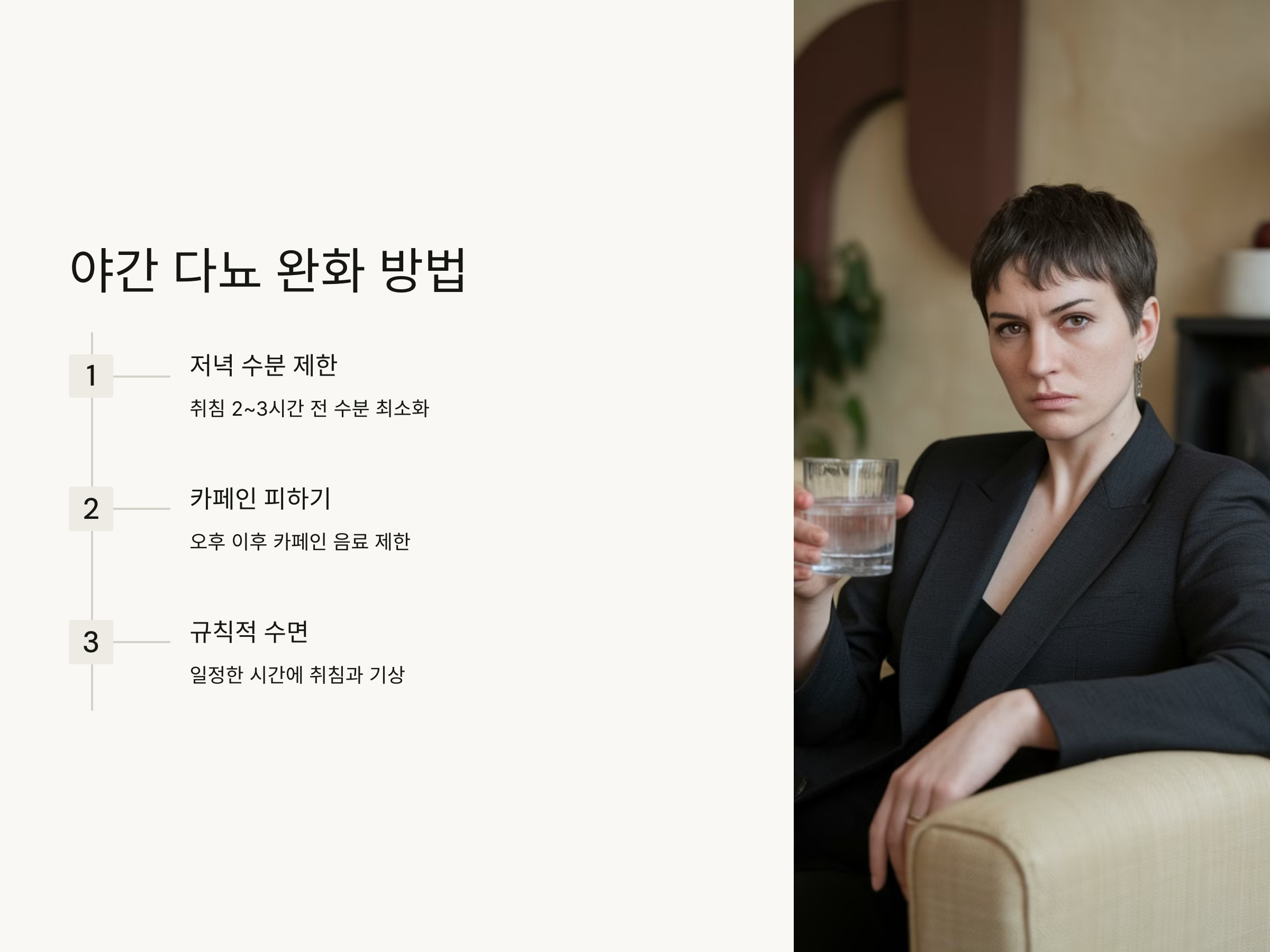- 저녁 시간대 수분 섭취 제한: 잠들기 전 2~3시간 동안은 수분 섭취를 최소화하여 야간 배뇨를 줄입니다. citeturn0search13