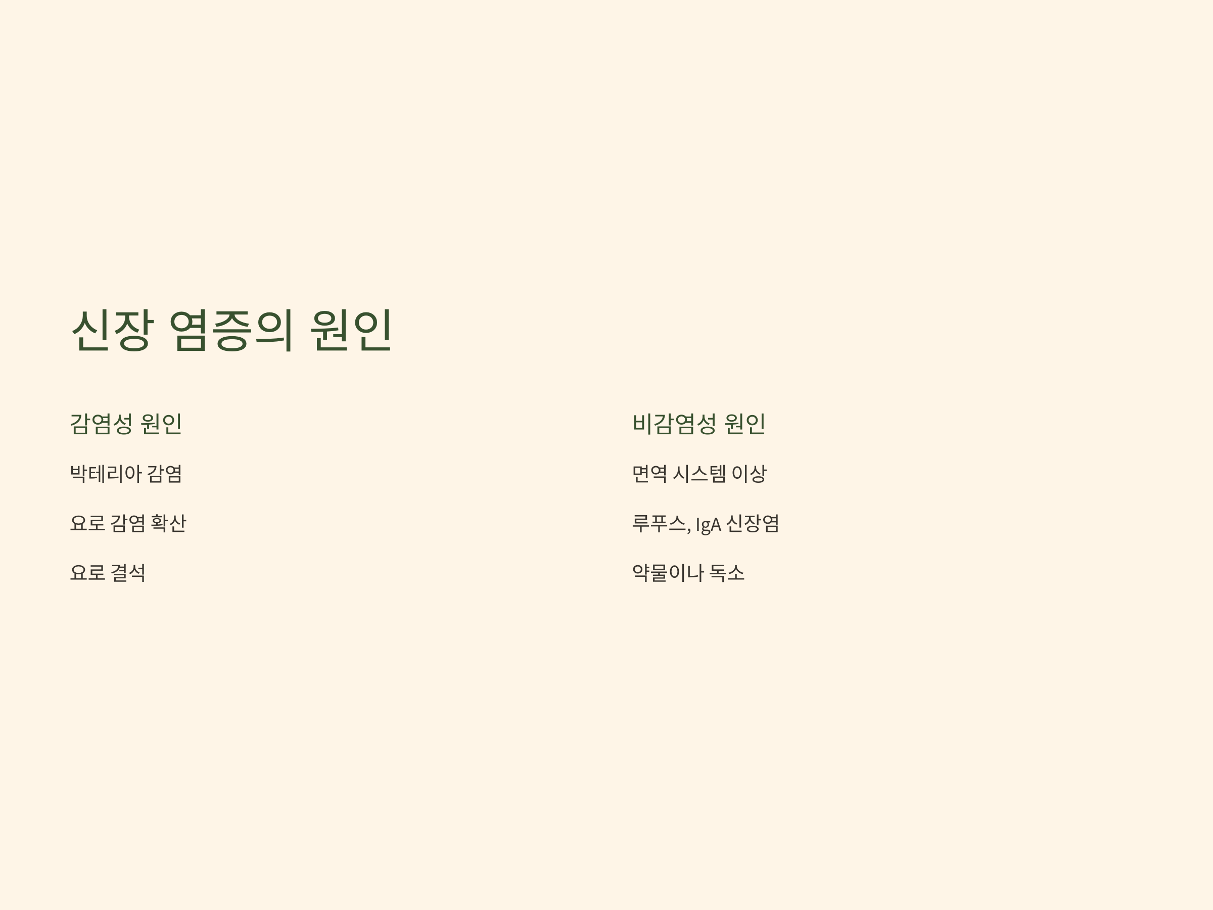 그 외에도 비감염성 원인으로는 면역 시스템의 이상이 있습니다. 예를 들어, 자가면역 질환인 루푸스(lupus)나 IgA 신장염 등도 신장 염증을 유발할 수 있습니다. 또한, 약물이나 독소에 의한 신장 손상도 염증을 일으킬 수 있습니다. 이러한 원인들은 신장 염증을 더욱 복잡하게 만들 수 있기 때문에, 정확한 진단을 받는 것이 중요합니다.