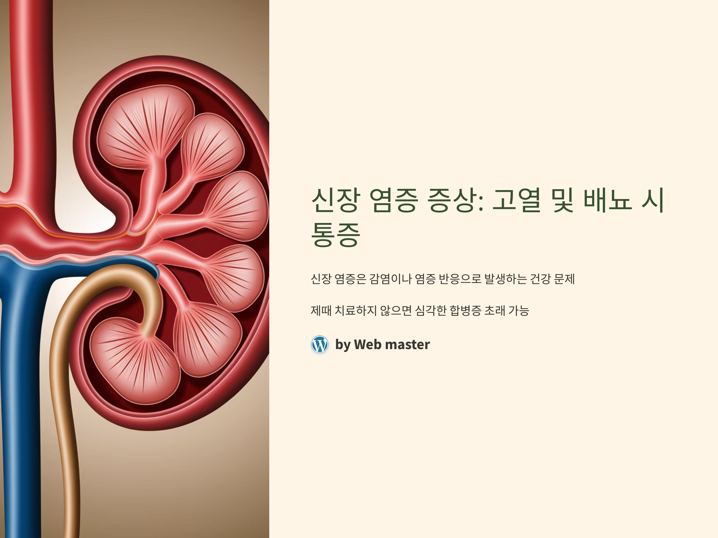 신장 염증은 신장이 감염되거나 염증 반응을 일으킬 때 발생하는 건강 문제로, 특히 고열과 배뇨 시 통증을 동반할 수 있습니다. 이 증상들은 신장염을 의심하게 만드는 주요 징후로, 제때 치료하지 않으면 심각한 합병증을 초래할 수 있습니다. 신장 염증은 주로 세균 감염에 의해 발생하지만, 다양한 원인에 의해 발생할 수 있으므로 증상을 정확히 파악하고 빠르게 대응하는 것이 중요합니다.