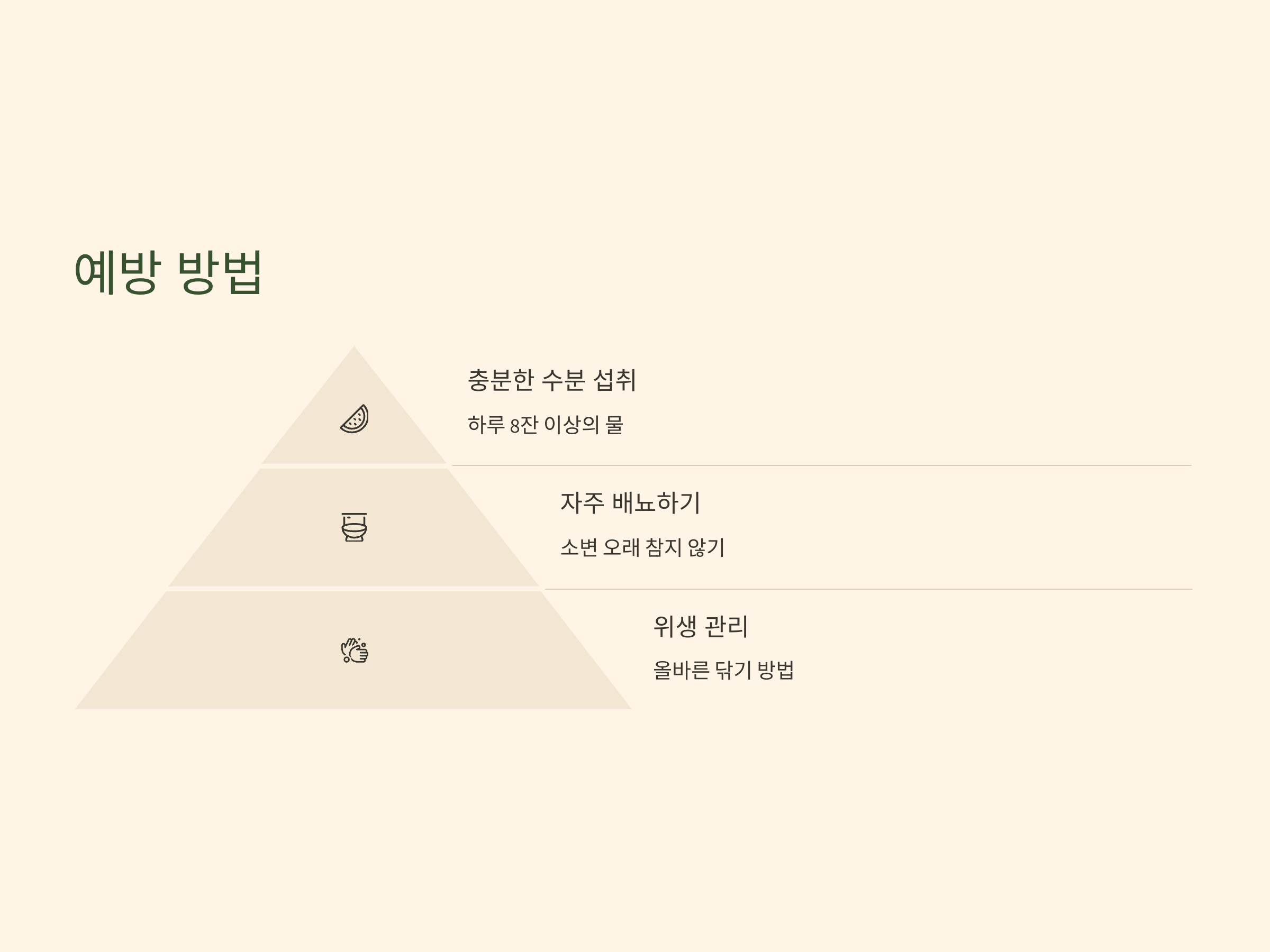 또한, 자주 배뇨를 하여 소변이 방광에 오래 머물지 않도록 해야 합니다. 위생 관리를 철저히 하고, 특히 배뇨 후에는 외음부를 닦을 때 앞에서 뒤로 닦는 것이 좋습니다. 이렇게 하면 세균이 요도로 들어가는 것을 예방할 수 있습니다.
