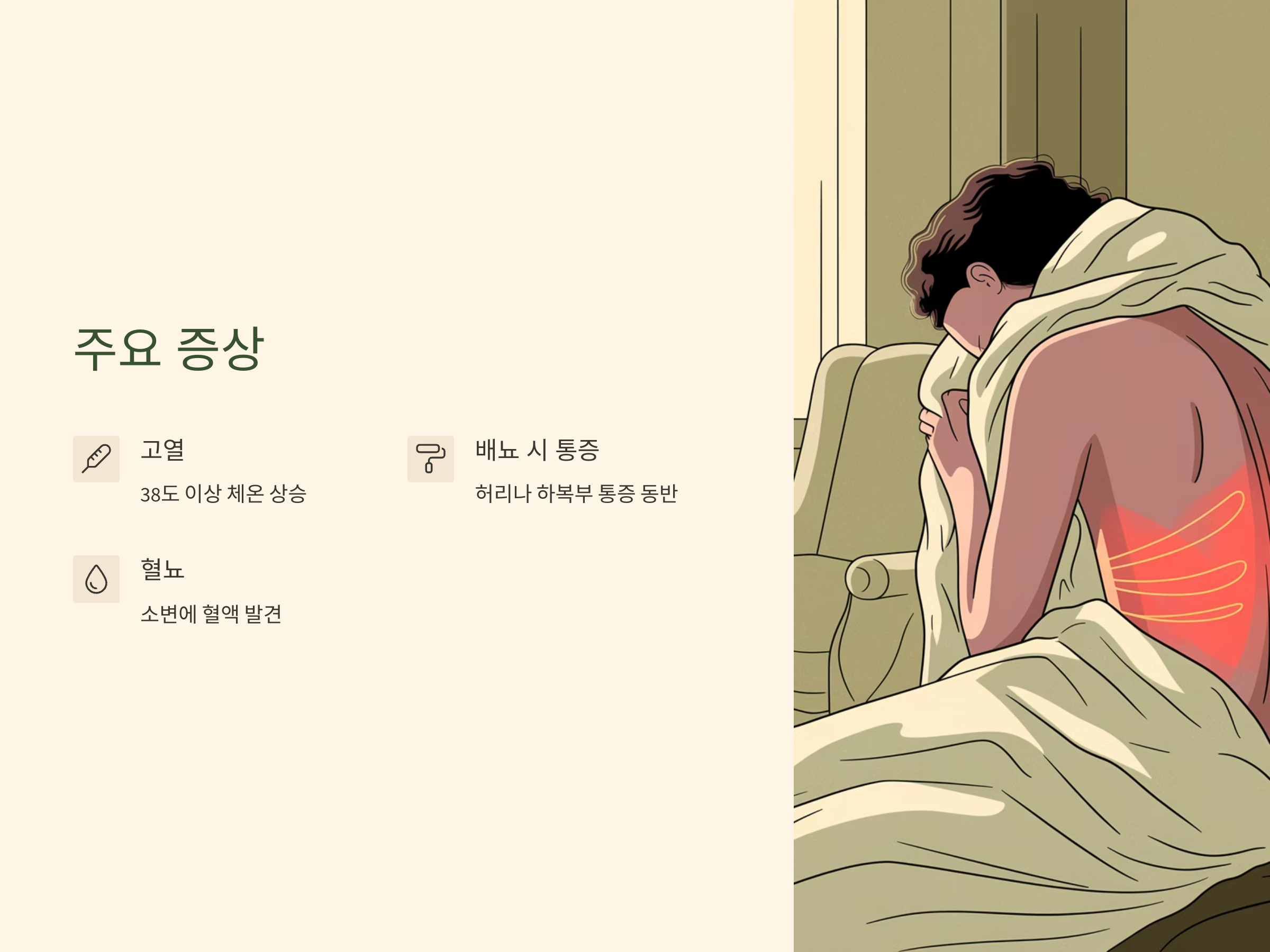 신장 염증의 가장 두드러진 증상은 고열과 배뇨 시 통증입니다. 감염이 신장에 영향을 미칠 때, 체온이 급격하게 상승할 수 있으며, 38도 이상의 고열이 자주 나타날 수 있습니다. 이 외에도 배뇨를 할 때 불편함이나 통증을 느끼는 경우가 많습니다. 통증은 배뇨 중에만 느껴지는 것이 아니라, 허리나 하복부에도 통증을 동반할 수 있습니다. 또한, 혈뇨가 발생하는 경우도 있으며, 이는 신장에 염증이 있다는 신호로 해석할 수 있습니다.