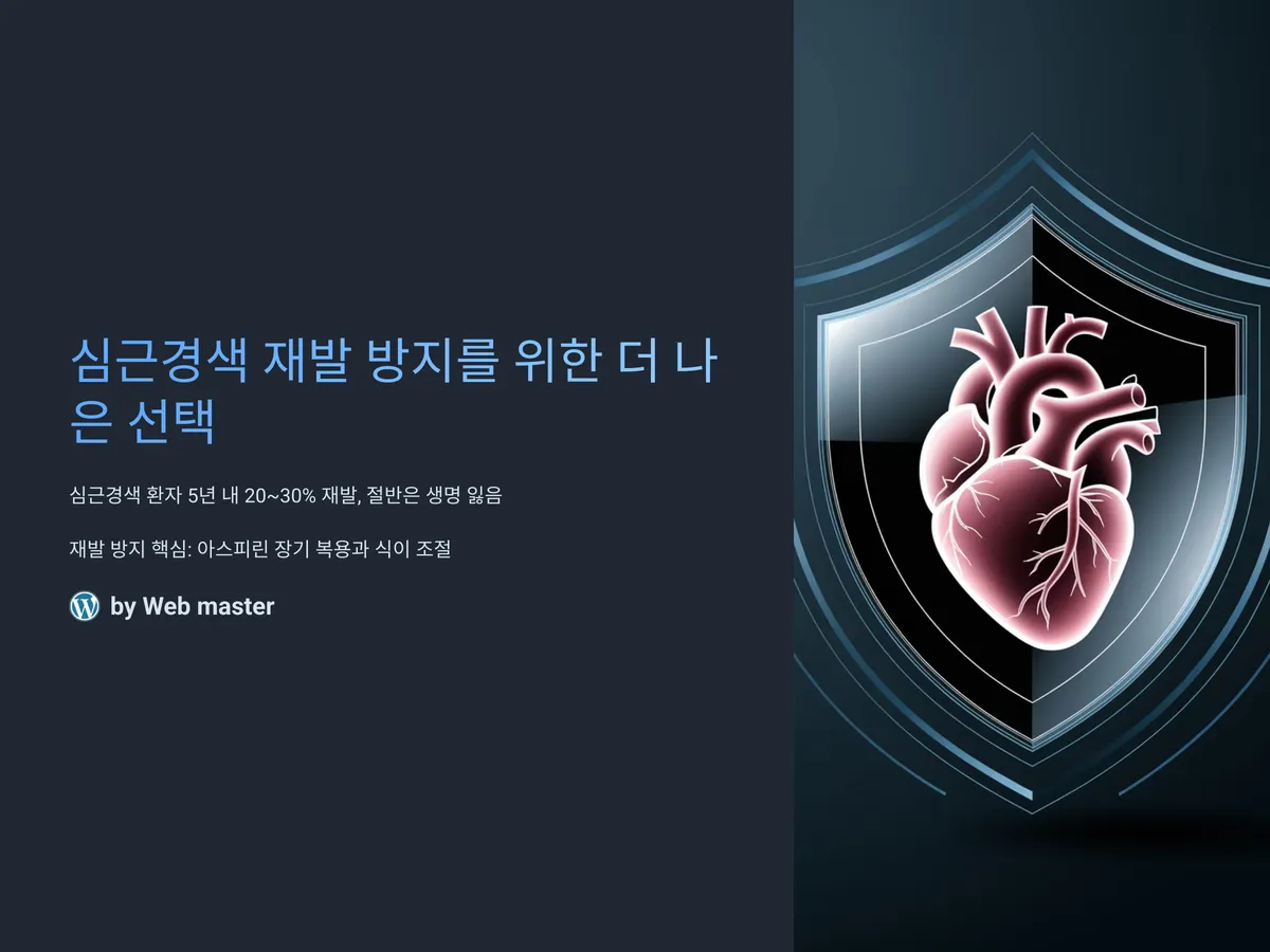 심근경색은 한 번 발생하면 심각한 후유증과 재발의 위험을 안고 살아가야 합니다. 특히 최근 연구에 따르면 심근경색을 한 번 겪은 환자는 5년 이내에 약 20~30%가 재발을 경험하며, 그 중 절반은 생명을 잃는 것으로 나타났습니다. 이에 따라 재발 방지를 위한 체계적인 관리가 필수적입니다. 그 중심에는 바로 ‘아스피린의 장기 복용’과 ‘식이 조절’이라는 두 가지 강력한 무기가 있습니다. 아스피린은 혈소판 응집을 억제해 혈전 생성을 막아주며, 식단 조절은 동맥경화의 위험 인자를 줄여줍니다.