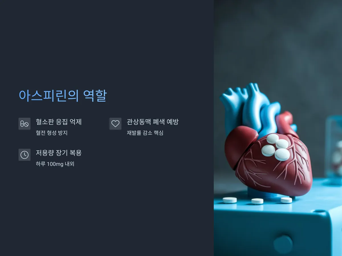 아스피린은 항혈소판제로서 혈소판이 서로 달라붙어 혈전을 형성하는 것을 방지합니다. 이는 심근경색의 주요 원인인 관상동맥의 폐색을 예방하는 데 중요한 역할을 합니다. 특히 심근경색 이후에는 혈관 내벽이 약해져 작은 자극에도 혈전이 쉽게 생길 수 있으므로, 이를 방지하는 것이 재발률을 낮추는 핵심입니다.