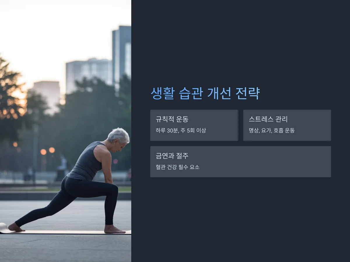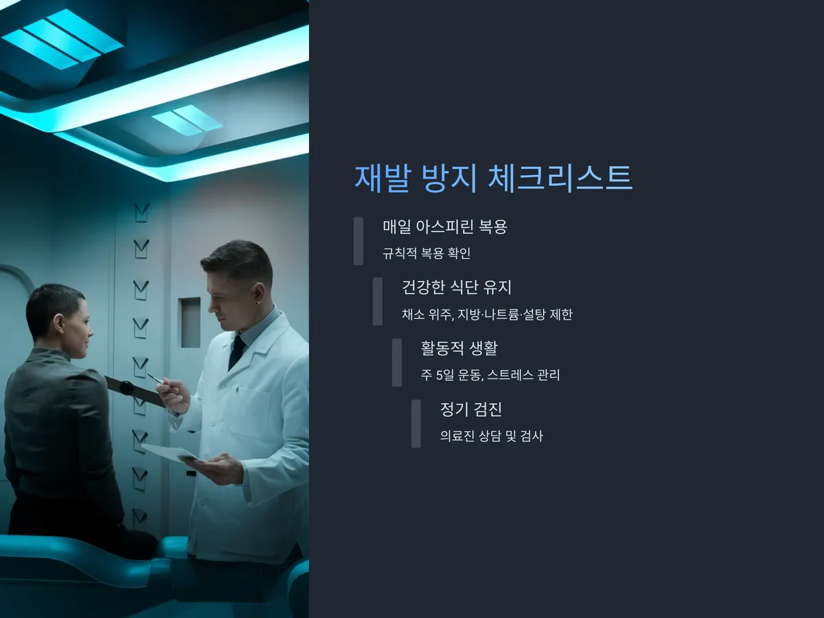 아스피린과 식이조절만으로는 충분하지 않습니다. 반드시 운동과 스트레스 관리, 금연, 절주가 병행되어야 진정한 재발 방지가 이루어집니다. 특히 하루 30분 이상, 주 5회 이상 중등도 유산소 운동(걷기, 자전거 타기 등)은 심혈관 건강 유지에 큰 도움이 됩니다.