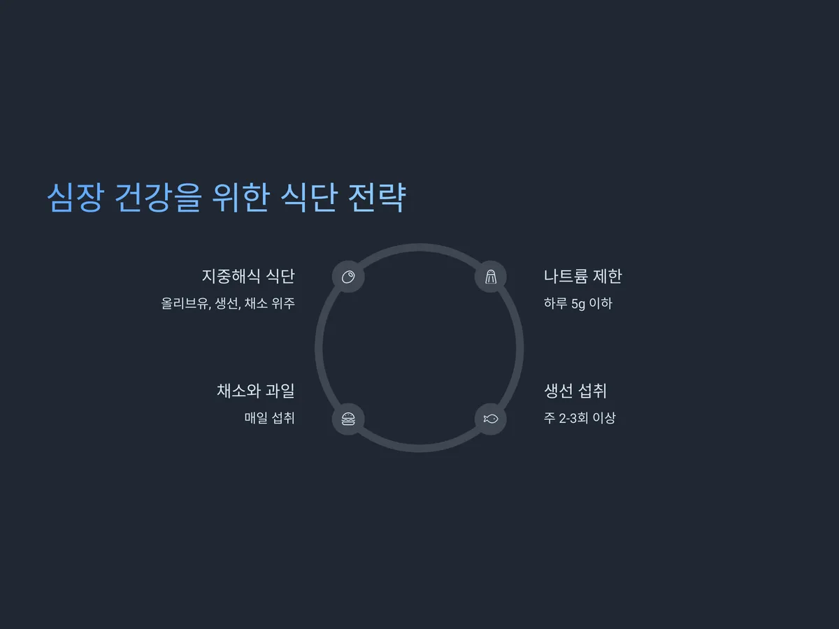 최근 각광받고 있는 지중해식 식단은 올리브유, 생선, 채소, 견과류, 통곡물 위주로 구성되어 있어 심혈관 질환 예방에 탁월한 효과를 보이고 있습니다. 하루 소금 섭취량은 5g 이하, 콜레스테롤은 200mg 이하로 관리하는 것이 권장되며, 일주일에 2~3회 이상의 생선 섭취, 매일 채소와 과일을 섭취하는 것이 이상적입니다.