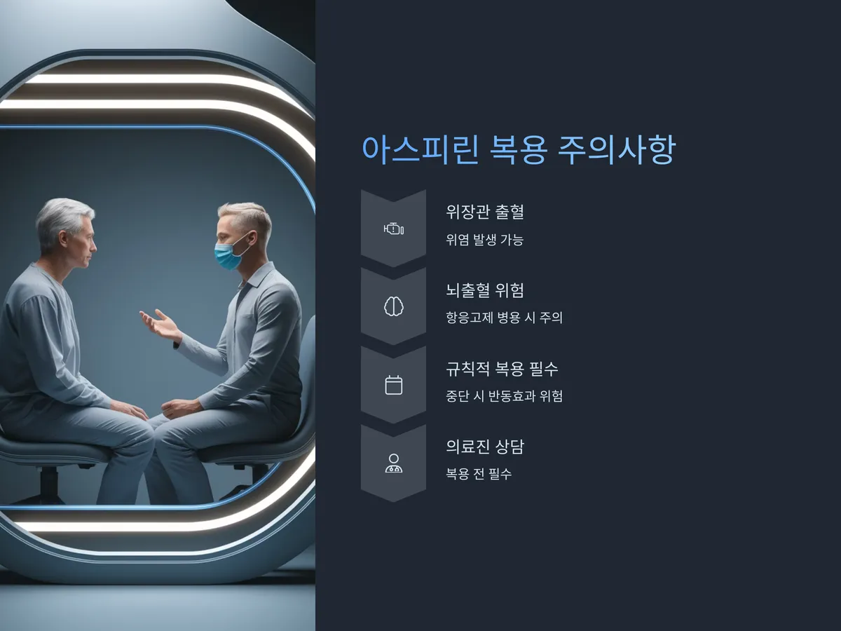 아스피린은 위장관 출혈, 위염, 드물게 뇌출혈과 같은 부작용이 있을 수 있습니다. 특히 위장이 약하거나 항응고제를 병용 중인 경우에는 출혈 위험이 높아질 수 있으므로, 복용 전 반드시 의료진과 상담해야 합니다. 최근에는 위장장애를 줄이기 위해 장용 코팅이 된 아스피린도 사용되고 있으며, 위 보호약과 함께 복용하는 방식도 고려되고 있습니다.