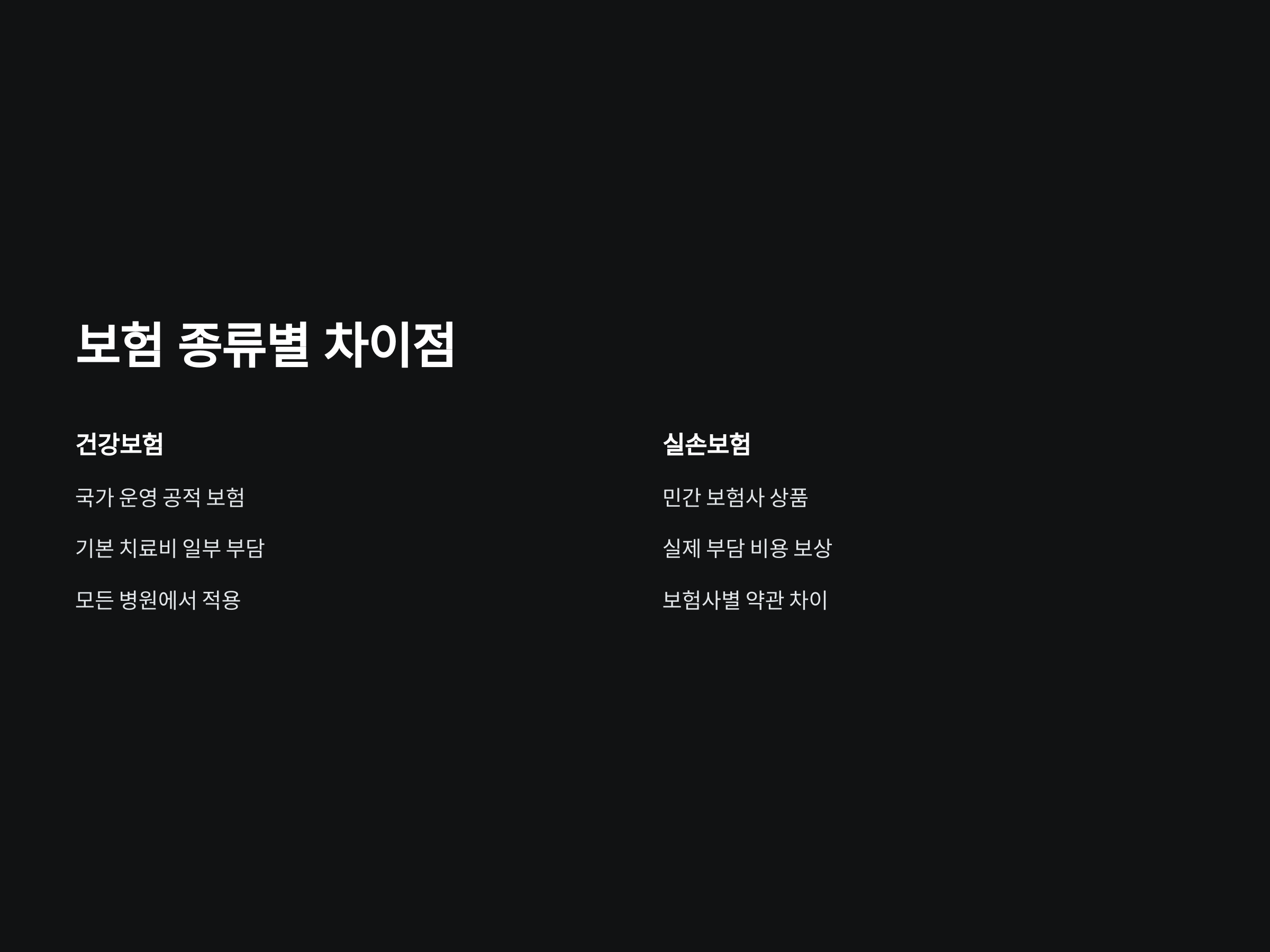 실손보험과 건강보험은 치료비 부담을 줄이는 데 도움을 주지만, 그 방식에는 차이가 있습니다. 건강보험은 국가에서 운영하는 공적 보험으로, 일정 비율의 치료비를 부담해주며, 대부분의 병원에서 적용됩니다. 그러나 건강보험이 적용되지 않는 부분이나 고액 치료비는 실손보험이 보장하는 경우가 많습니다.