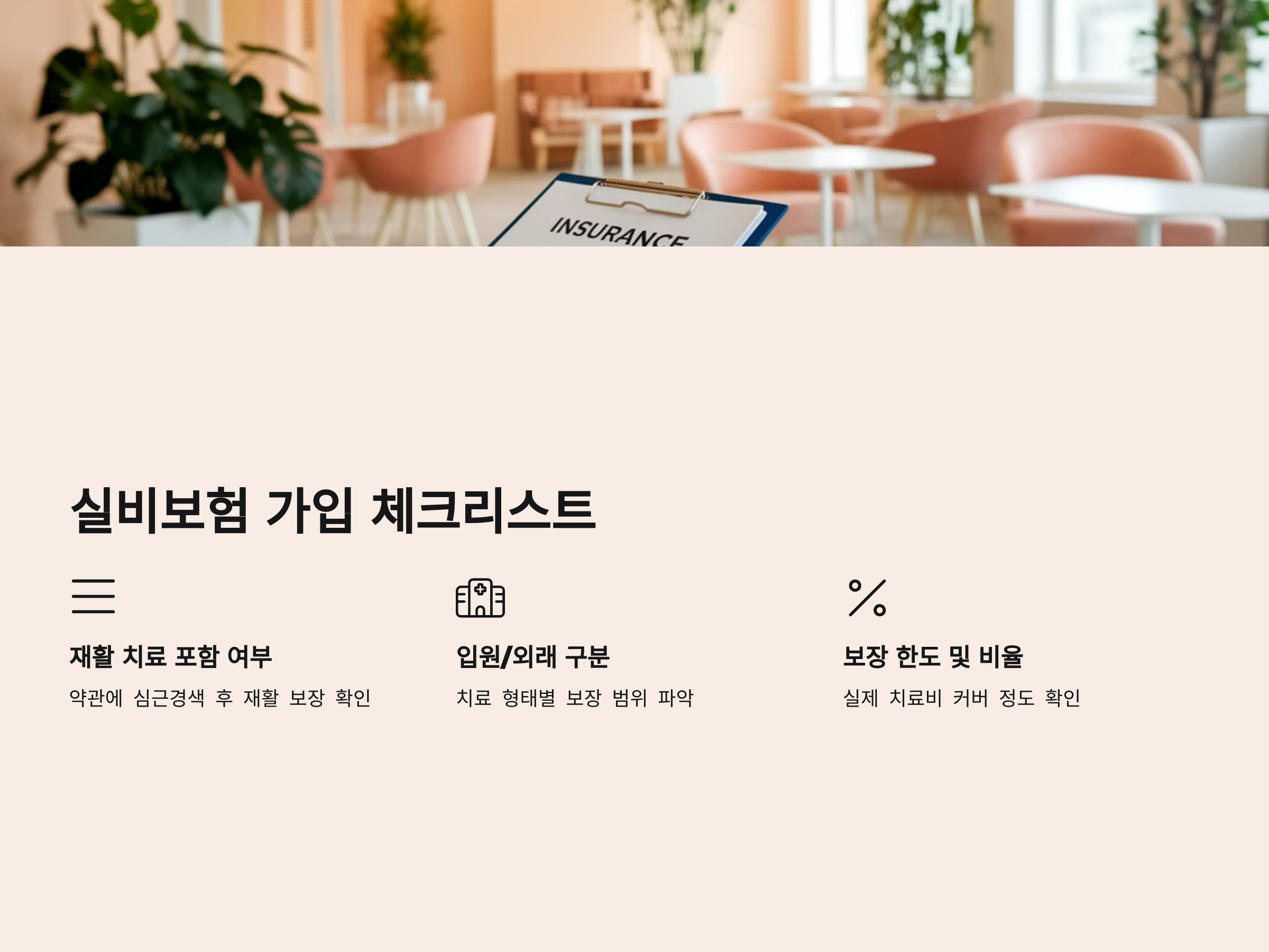 실비보험을 가입하기 전에 재활 치료를 보장 받을 수 있는지 확인하는 것은 매우 중요합니다. 아래는 실비보험 가입 시 재활 치료 관련 체크리스트입니다: