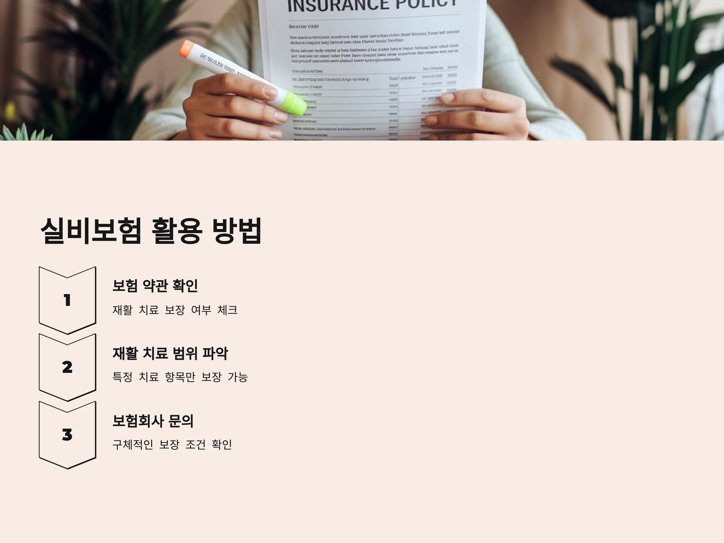 - 보험회사에 문의: 실비보험의 보장 범위에 대해 불확실한 부분이 있다면, 보험회사에 문의하여 구체적인 보장 조건을 확인하고, 재활 치료가 포함되는지 여부를 명확히 확인하는 것이 좋습니다.