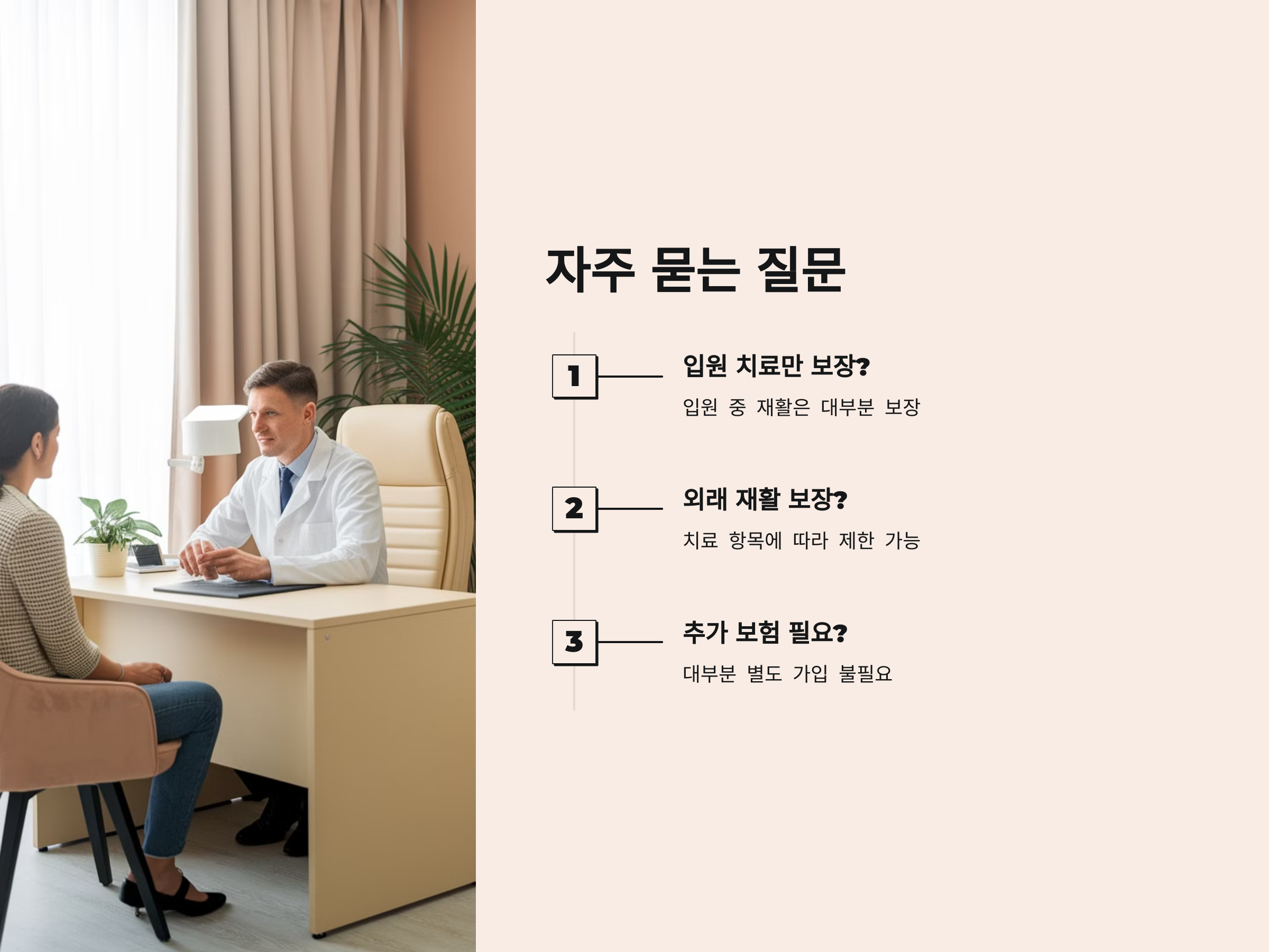 - 외래비: 외래에서 재활 치료를 받을 경우, 보험이 보장하는 범위 내에서 일부 비용이 지원될 수 있습니다.