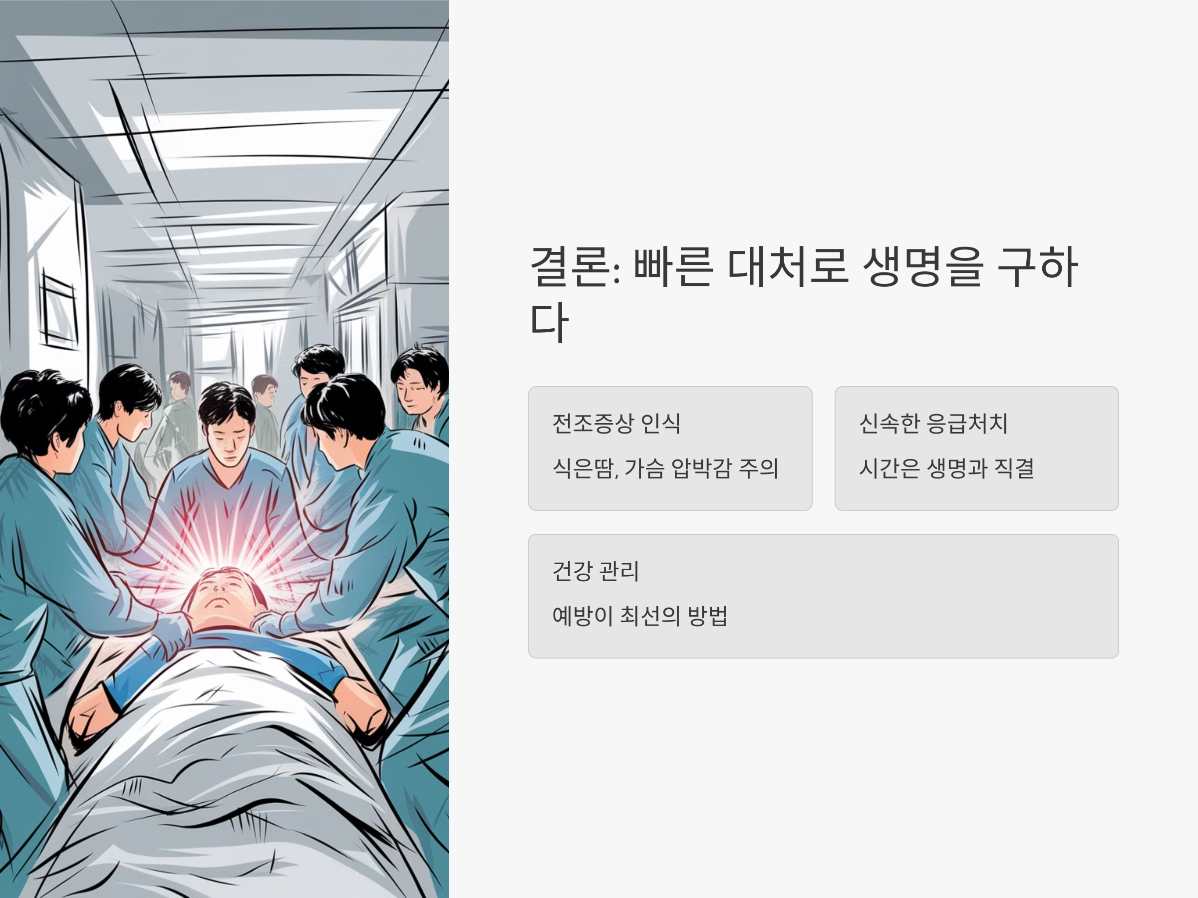 심근 경색은 갑작스럽게 발생할 수 있지만, 대부분의 경우에는 식은땀이나 가슴 압박감과 같은 전조증상이 나타납니다. 이러한 증상을 간과하지 말고, 바로 응급처치를 취하는 것이 중요합니다. 증상이 나타났을 때 침착하게 대처하고, 가능한 한 빨리 병원에 가는 것이 생명을 구하는 방법입니다.