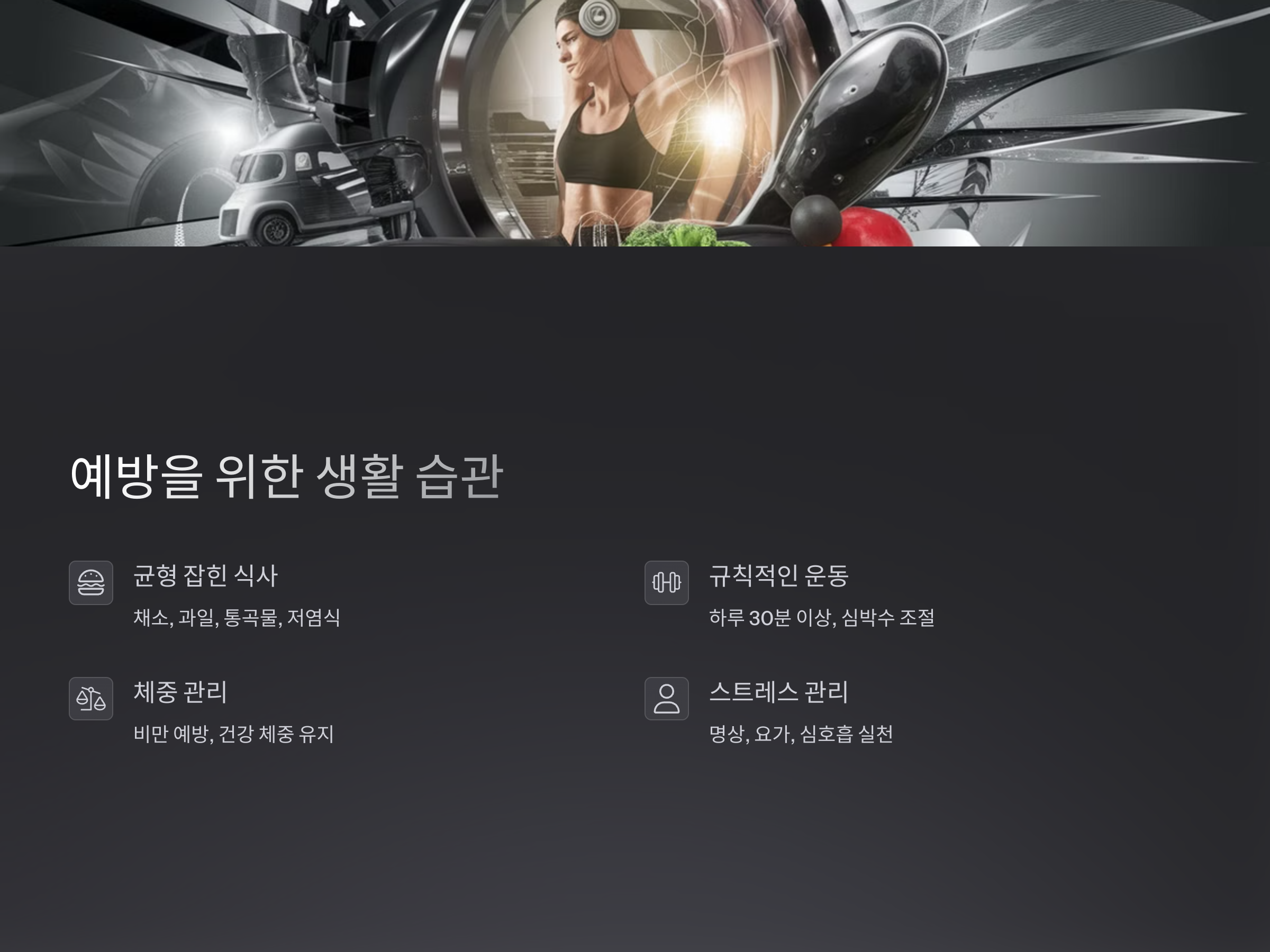 규칙적인 운동은 심혈관 건강을 유지하는 데 큰 도움이 됩니다. 하루에 최소 30분 이상의 운동을 통해 심장 기능을 강화하고, 심박수를 조절하는 것이 필요합니다. 또한, 스트레스 관리는 심근 산소 부족을 예방하는 데 필수적입니다. 명상이나 요가, 심호흡 등을 통해 스트레스를 줄이는 방법을 실천하는 것이 좋습니다.