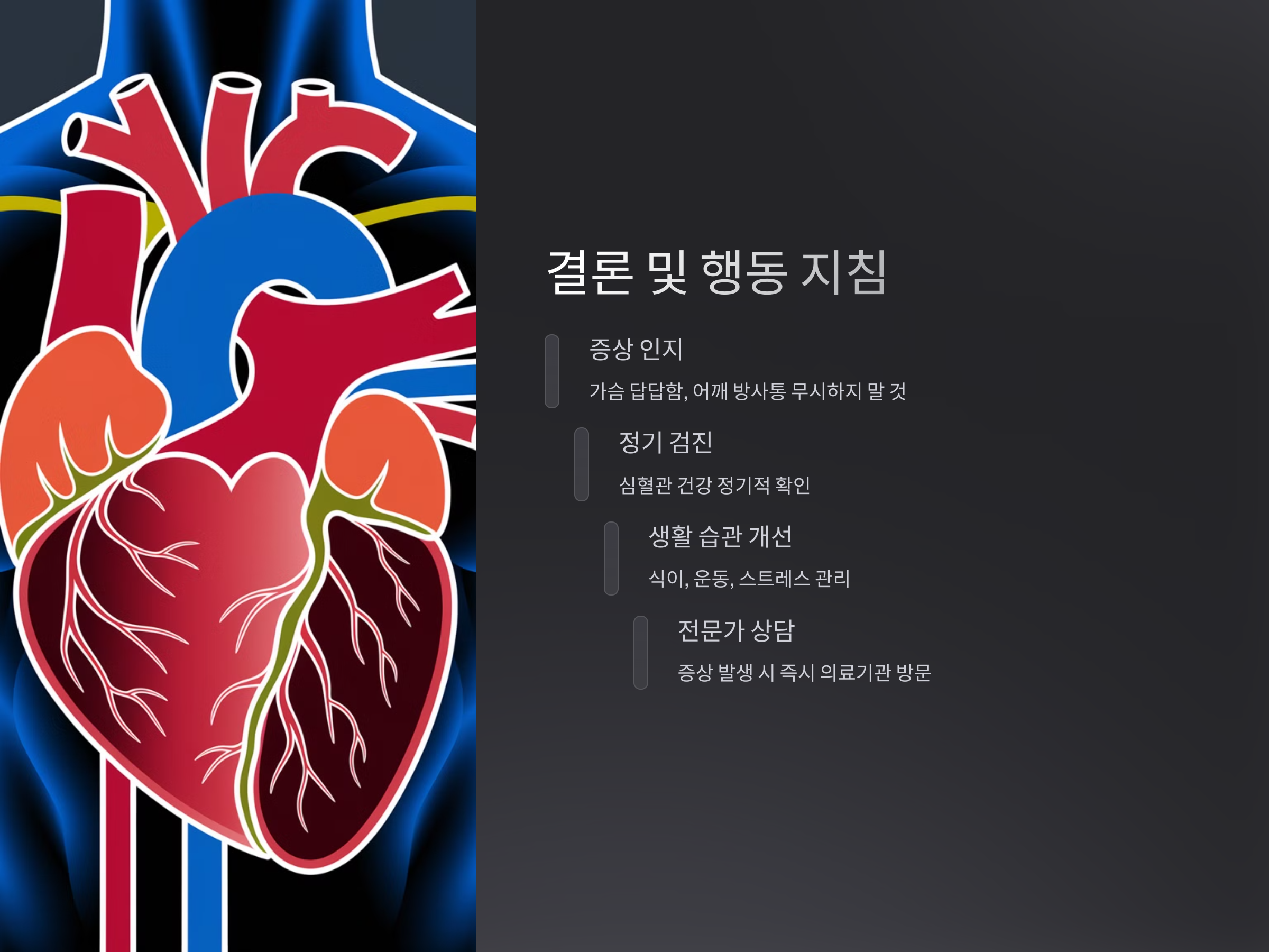 심근 산소 부족으로 인한 가슴 답답함과 어깨 방사통은 심혈관 질환의 주요 증상 중 하나입니다. 이를 무시하지 않고 적절한 진단과 치료를 받는 것이 중요합니다. 정기적인 건강 검진과 생활 습관 개선을 통해 심혈관 질환을 예방하고, 심장 건강을 지킬 수 있습니다. 가슴 통증이나 어깨 방사통 등의 증상이 있을 경우 즉시 의료 기관을 찾아 정확한 진단을 받는 것이 중요합니다.