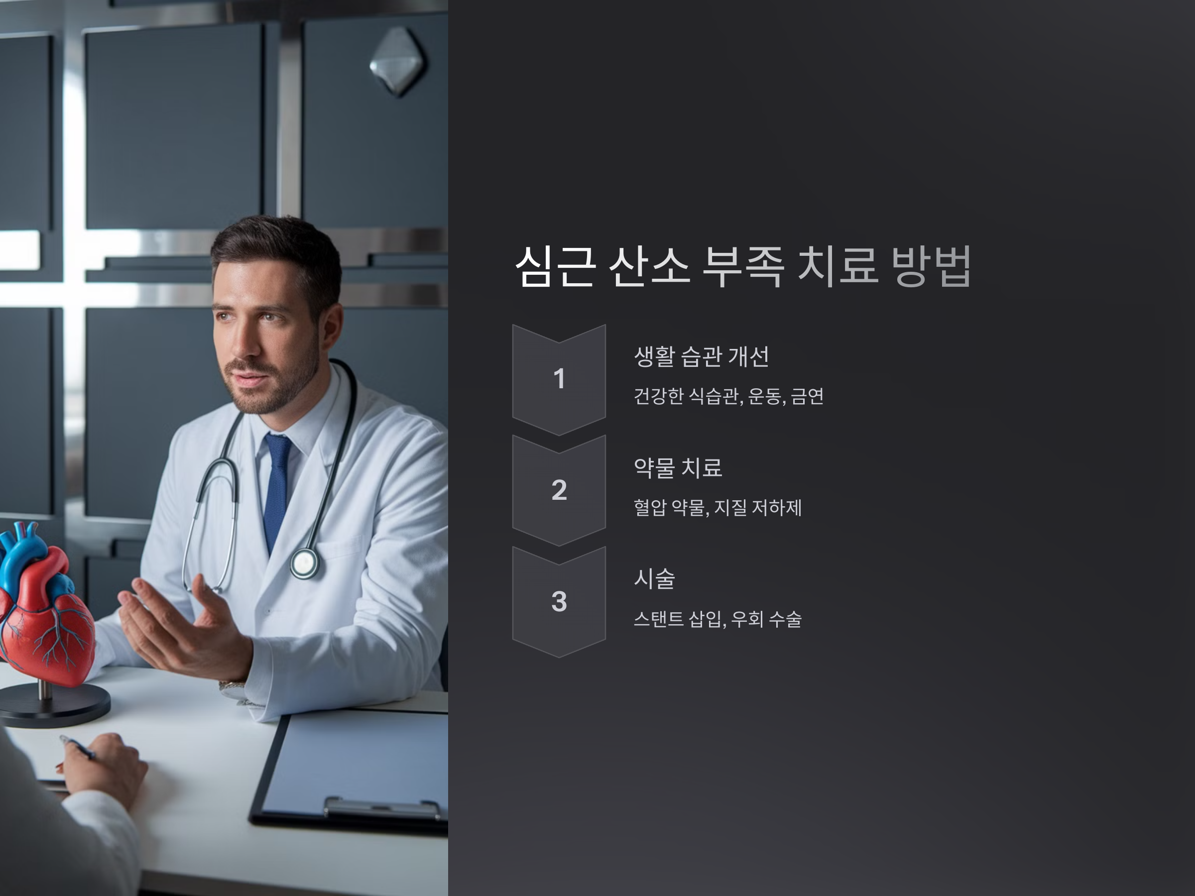 심근 산소 부족을 해결하기 위한 치료 방법은 원인에 따라 다릅니다. 가장 중요한 것은 생활 습관 개선입니다. 건강한 식습관을 유지하고, 규칙적인 운동을 하며, 흡연과 음주는 피해야 합니다. 또한, 스트레스 관리와 충분한 수면도 매우 중요합니다.