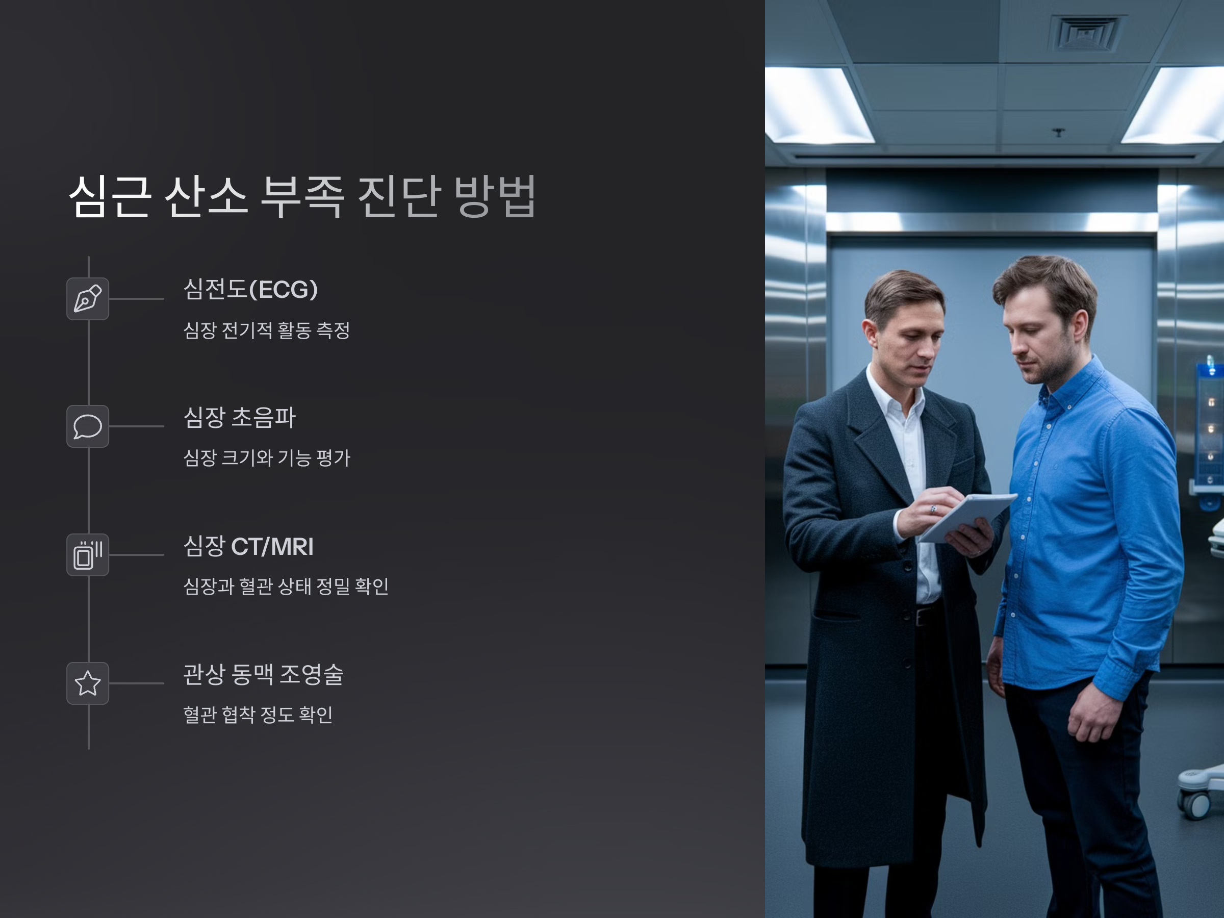 심근 산소 부족을 진단하기 위해서는 여러 가지 방법이 사용됩니다. 가장 일반적인 방법은 심전도(ECG) 검사입니다. 심전도는 심장의 전기적 활동을 측정하여 비정상적인 리듬이나 이상 신호를 감지할 수 있습니다. 또한, 심장 초음파(심초음파)를 통해 심장의 크기와 기능을 평가하며, 심장 CT나 MRI 검사를 통해 심장과 혈관의 상태를 정밀하게 확인할 수 있습니다.
