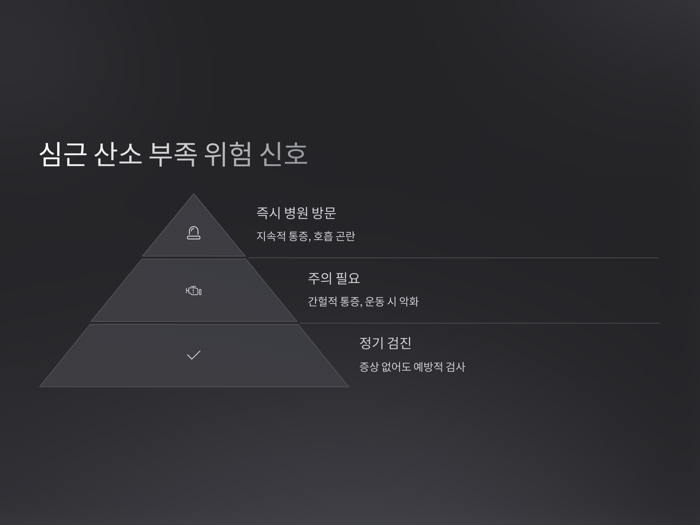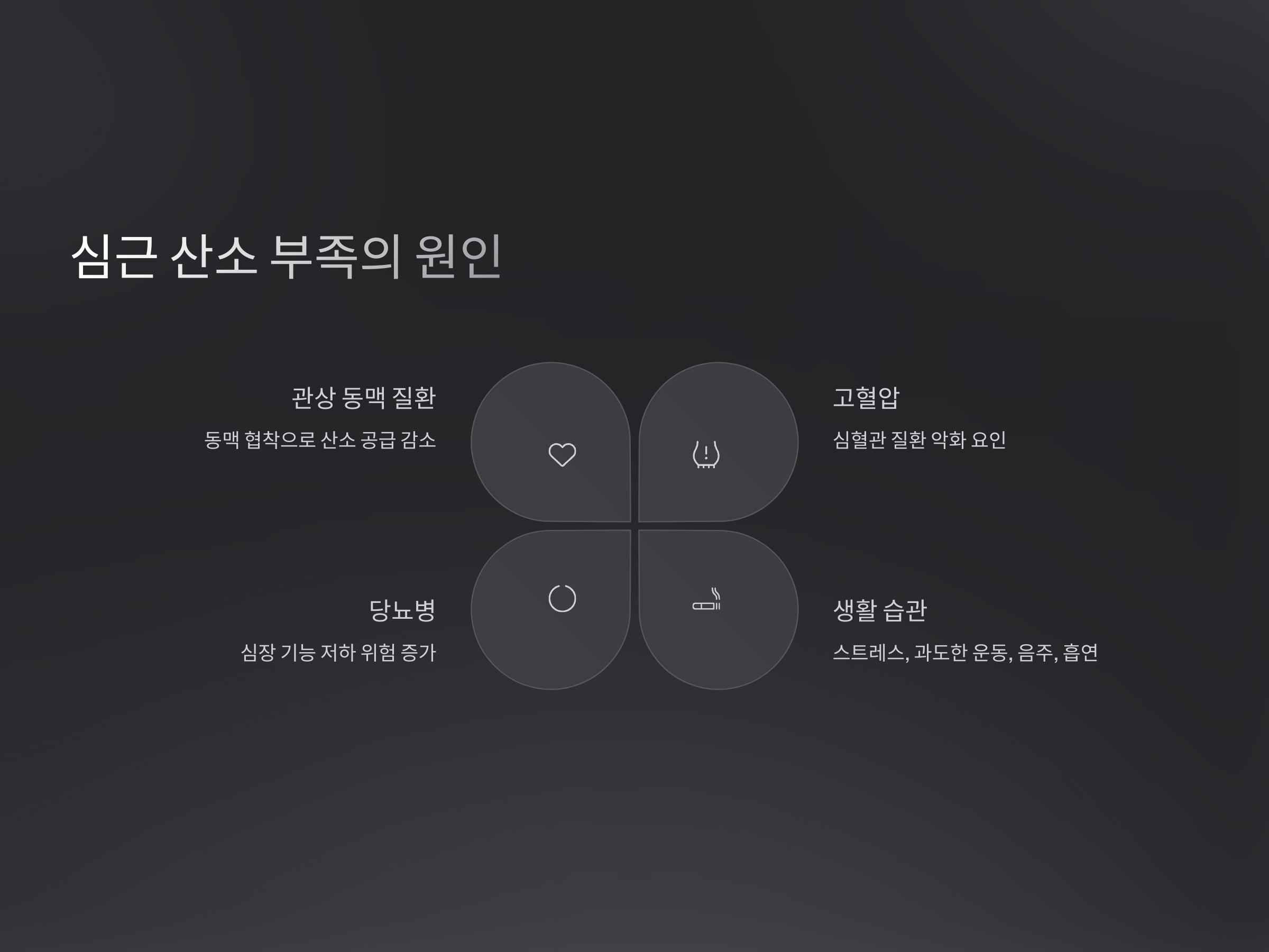 심근 산소 부족이 지속되면 심장 근육의 기능이 저하되어 심각한 심장 질환으로 발전할 수 있습니다. 그 외에도 스트레스, 과도한 운동, 음주 및 흡연 등도 심장에 부담을 주어 산소 공급에 문제를 일으킬 수 있습니다.