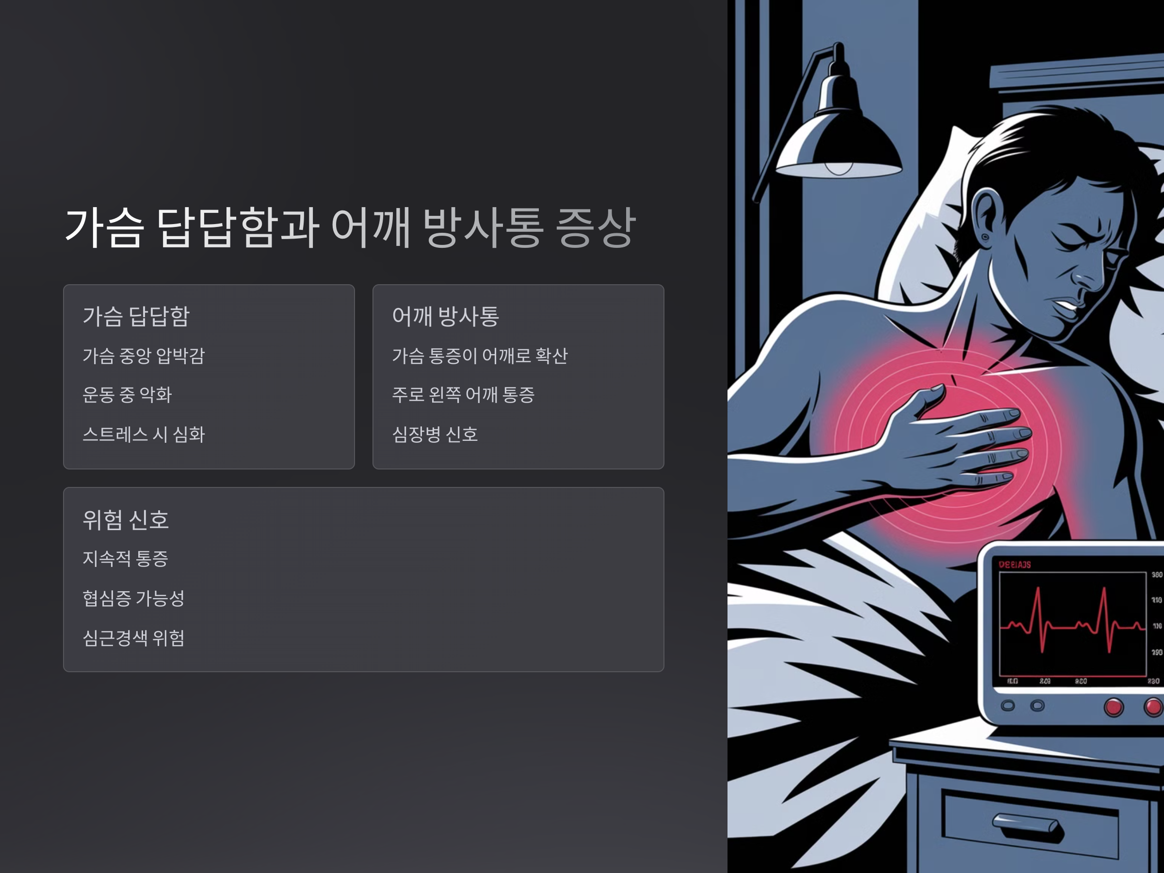 가슴 답답함은 심근 산소 부족의 가장 흔한 증상으로, 이는 일반적으로 가슴 중앙에 압박감이나 무겁고 답답한 느낌으로 나타납니다. 이 통증은 보통 운동 중이나 심리적 스트레스가 클 때 더 심해질 수 있으며, 진정되지 않고 지속될 경우 협심증이나 심근경색의 위험을 시사할 수 있습니다.