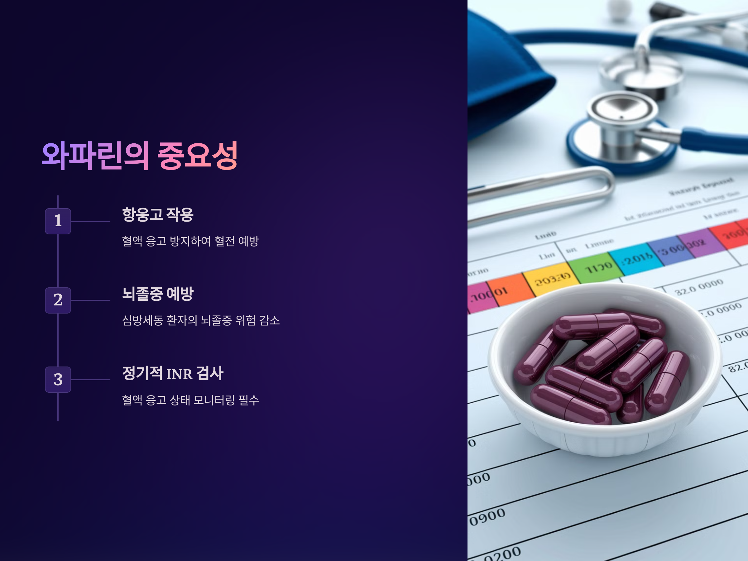와파린의 작용 원리는 혈액 응고에 관여하는 여러 물질들의 합성을 억제하는 것입니다. 이로 인해 혈액이 응고되는 것을 방지하고, 혈전이 형성되는 것을 예방합니다. 심방세동 환자에서 와파린을 사용하면 뇌졸중을 예방할 수 있지만, 반대로 출혈을 일으킬 위험이 높아지기도 합니다. 그래서 와파린 복용 시 혈액 응고 상태를 지속적으로 모니터링하는 것이 매우 중요합니다.