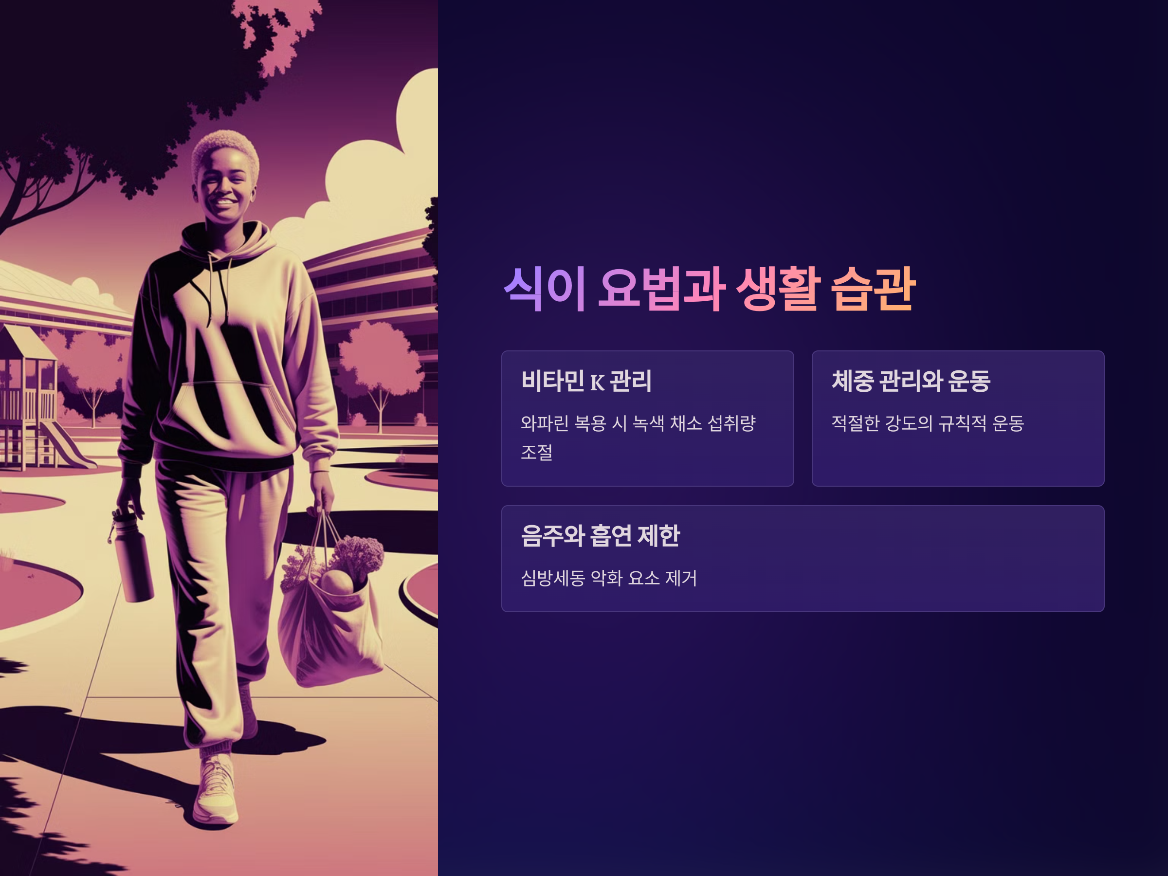 와파린을 복용 중인 환자는 정기적으로 혈액 검사를 통해 INR(International Normalized Ratio)을 확인해야 합니다. 이 수치가 너무 낮으면 혈전이 생길 수 있고, 너무 높으면 출혈의 위험이 커집니다. 따라서, INR 수치를 꾸준히 체크하고, 의사와 상의하여 적절한 용량을 조절하는 것이 필수적입니다.