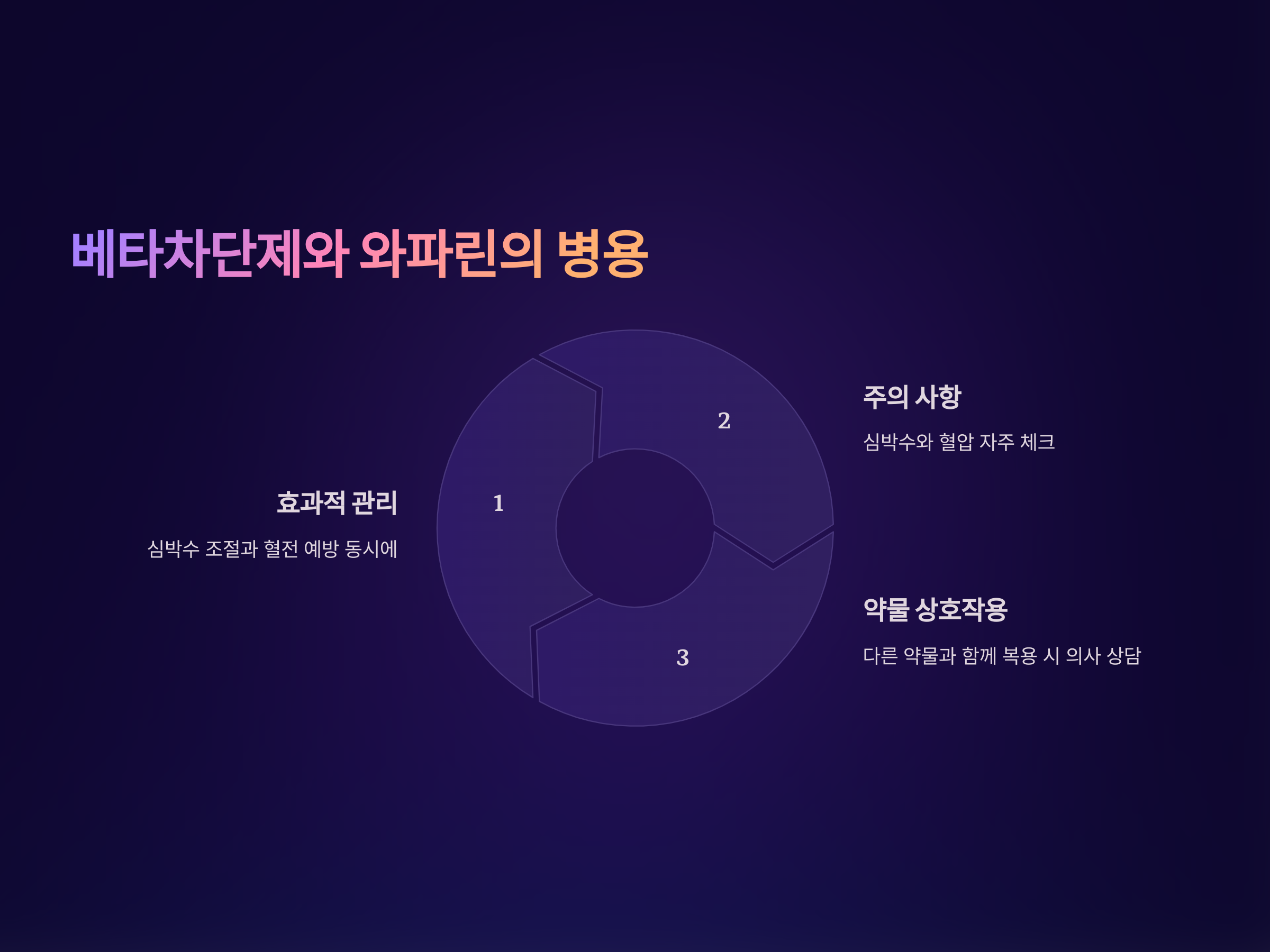 우선, 베타차단제를 사용하면 심박수가 느려지므로, 와파린의 효과를 모니터링하는 데 더욱 신중해야 합니다. 과도하게 심박수를 낮추면 혈액 순환에 문제가 생길 수 있으므로, 두 약물을 함께 복용하는 동안 심박수와 혈압을 자주 체크하는 것이 중요합니다.