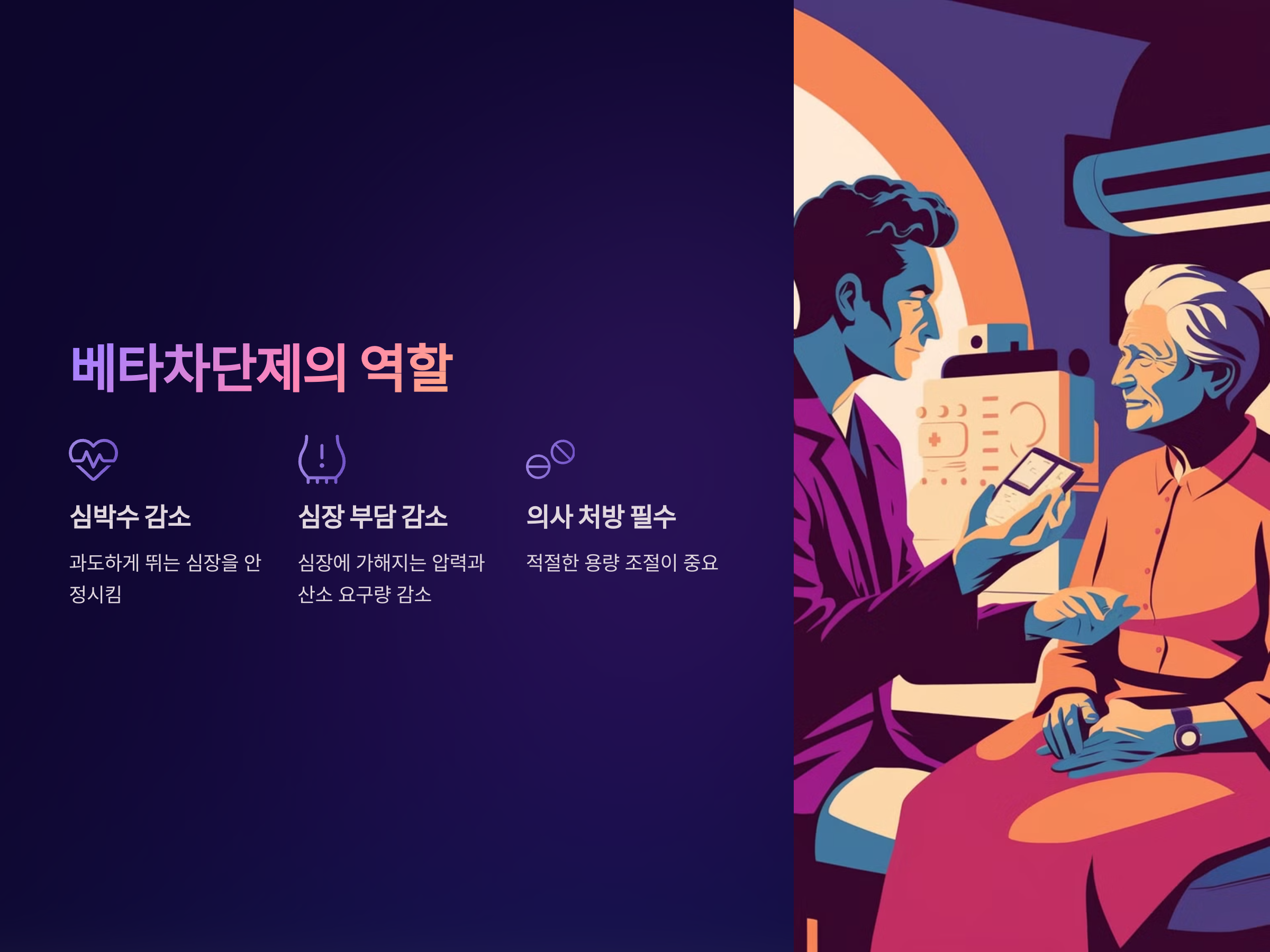 베타차단제는 심장 박동수를 낮추고, 심장의 과도한 부담을 줄여주는 약물입니다. 이는 심방세동 환자에게 매우 중요한 약물로, 주로 두 가지 방식으로 효과를 나타냅니다. 첫째, 베타차단제는 심박수를 감소시켜 심장이 과도하게 뛰는 상태를 안정시킵니다. 둘째, 이 약물은 심장에 가해지는 압력과 산소 요구량을 줄여줍니다. 이는 심방세동으로 인한 심장 부담을 경감시키는 데 중요한 역할을 합니다.