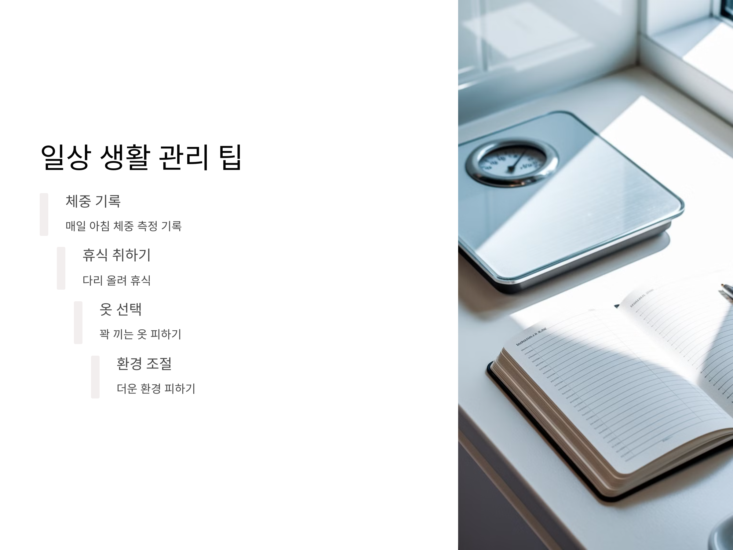 부종과 체중 증가를 관리하는 방법에는 여러 가지가 있습니다. 가장 중요한 것은 심부전의 원인에 맞는 치료를 받는 것입니다. 이를 통해 심장 기능을 개선하고, 체내 수분을 효과적으로 배출할 수 있습니다.