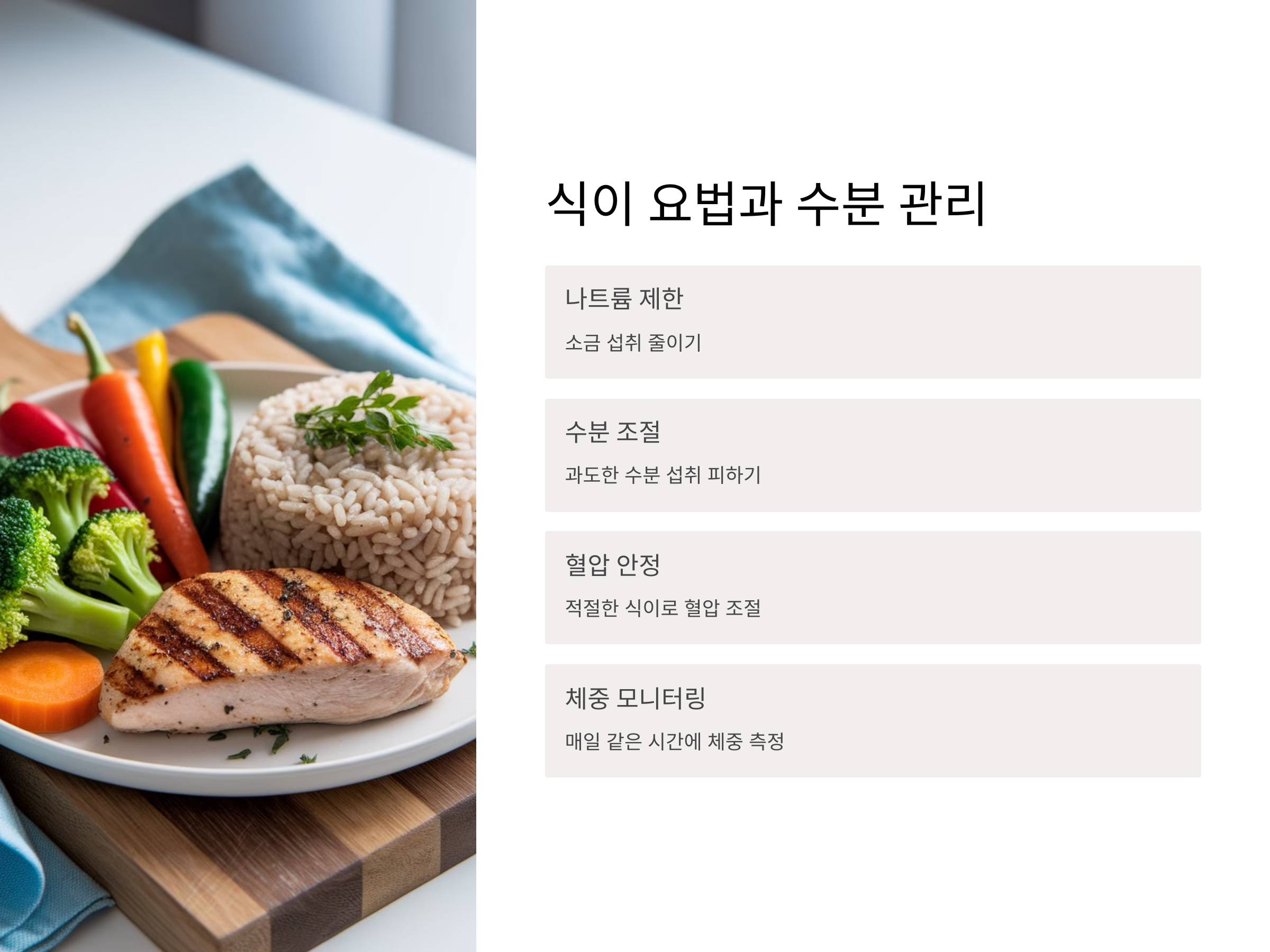 심부전 말기의 부종을 관리하기 위해서는 식이 요법과 수분 조절이 매우 중요합니다. 환자들은 나트륨 섭취를 제한해야 하며, 과도한 수분 섭취를 피하는 것이 필요합니다. 이를 통해 혈압을 안정시키고, 부종이 심해지는 것을 방지할 수 있습니다. 또한, 수분 제한을 잘 지키는 것이 체중 증가를 막는 데 중요한 역할을 합니다.