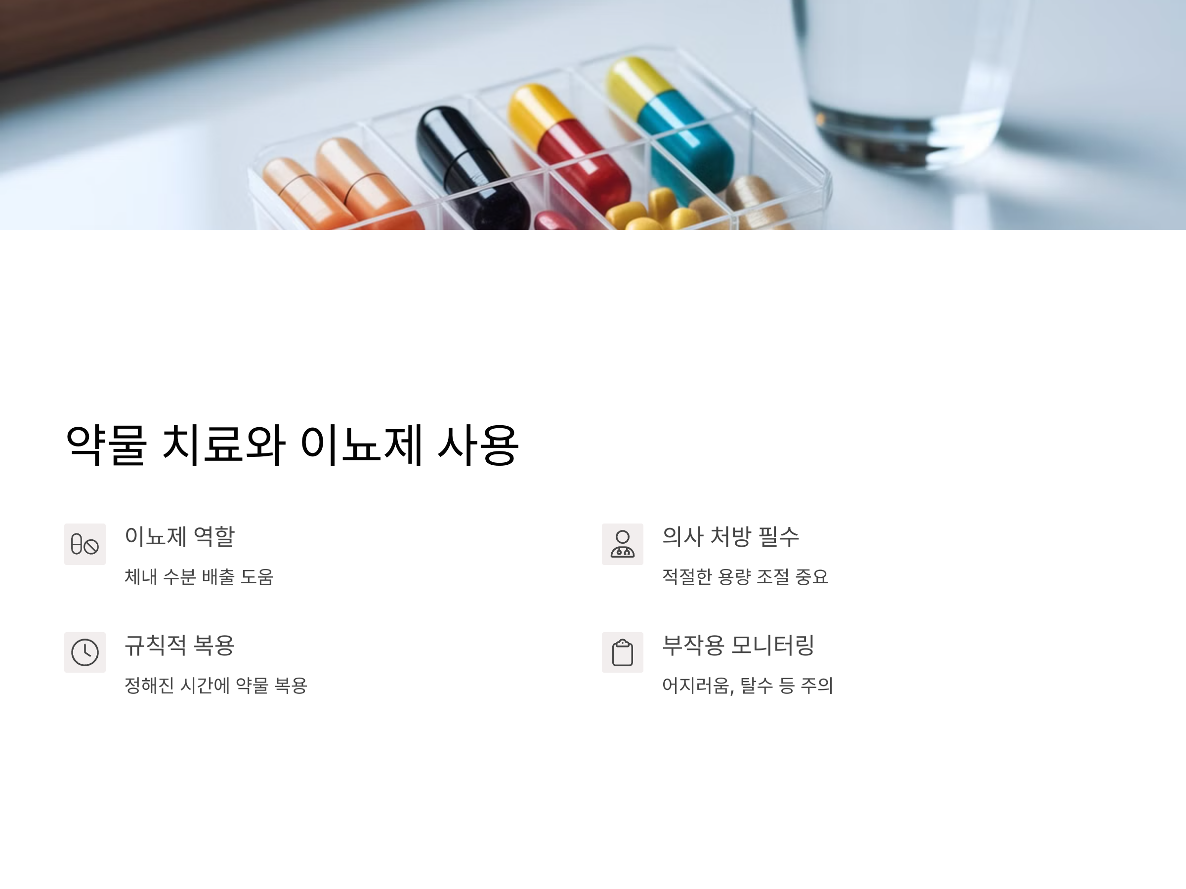 이뇨제는 체내 수분을 배출하는 데 도움을 주는 약물로, 심부전 말기의 환자들에게 중요한 역할을 합니다. 이 약물은 과도한 수분이 축적되는 것을 방지하고, 부종을 완화하는 데 효과적입니다. 이뇨제의 사용은 반드시 의사의 처방에 따라야 하며, 적절한 용량을 조절하여 사용해야 합니다.