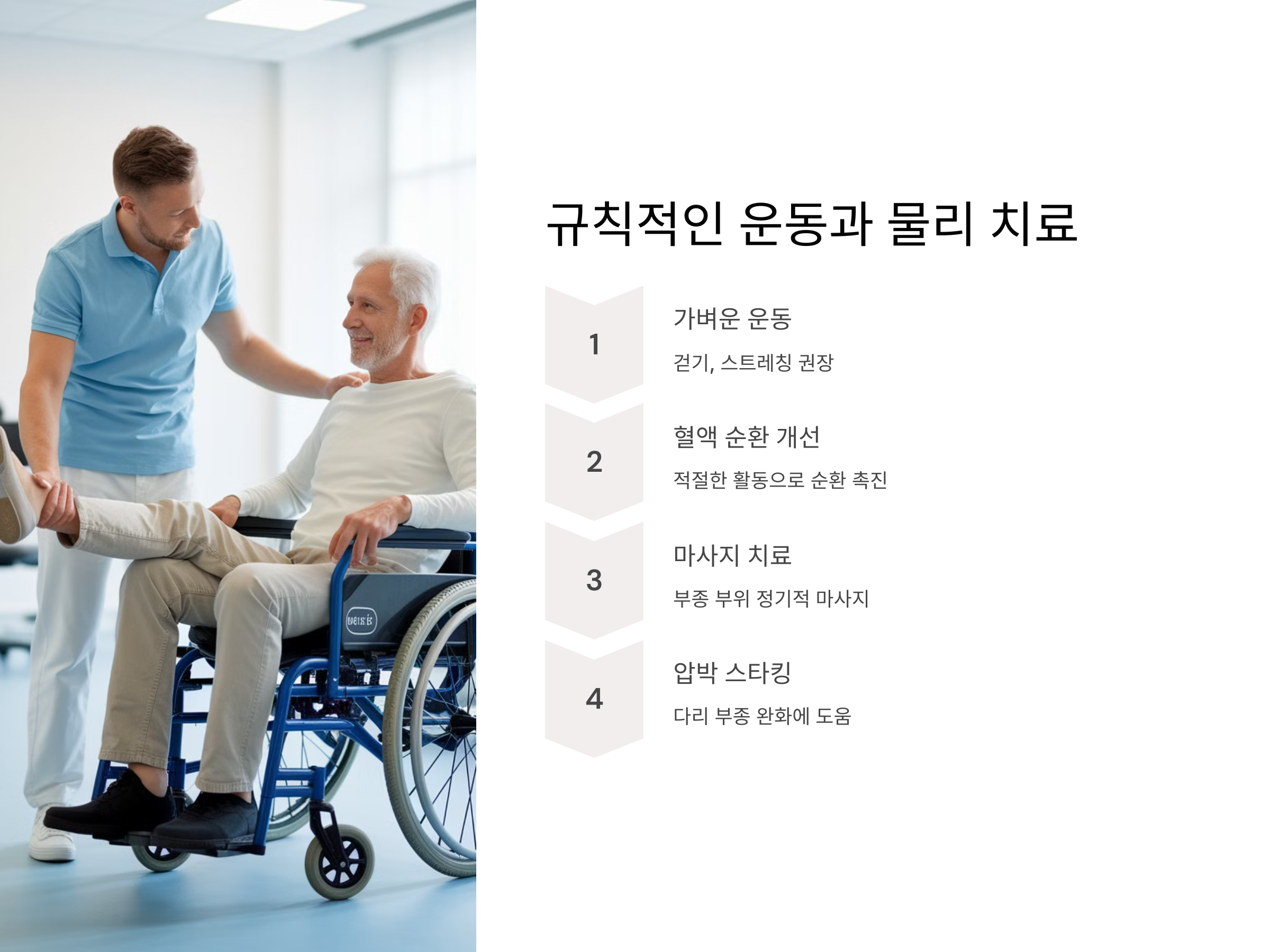 심부전 말기 환자에게 운동은 매우 중요합니다. 그러나 과도한 운동은 심장에 부담을 줄 수 있기 때문에 적절한 수준의 운동이 필요합니다. 걷기나 가벼운 스트레칭 등은 혈액 순환을 돕고, 부종을 완화하는 데 도움이 될 수 있습니다. 또한, 물리 치료를 통해 부종이 발생한 부위를 자주 마사지해 주는 것도 좋은 방법입니다.