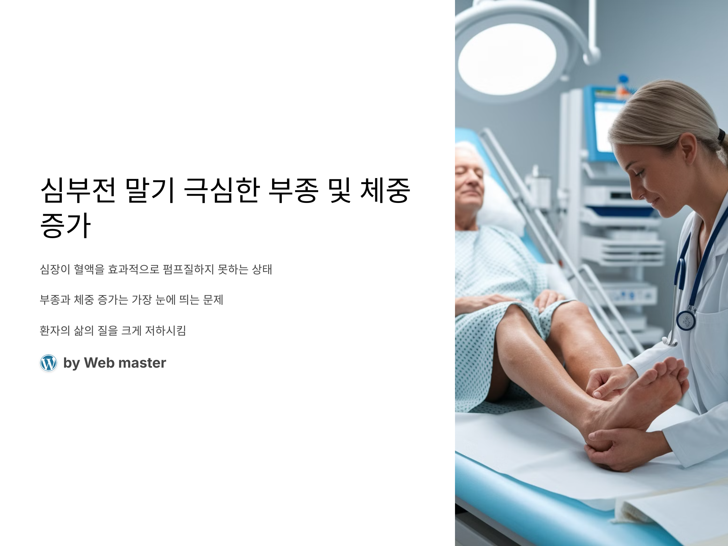 심부전은 심장이 혈액을 효과적으로 펌프질하지 못하는 상태를 말합니다. 특히 심부전 말기에서는 다양한 증상이 나타나지만, 그 중에서도 부종과 체중 증가는 가장 눈에 띄는 문제입니다. 이러한 증상은 환자에게 큰 불편을 초래하며, 삶의 질을 크게 저하시킬 수 있습니다. 심부전 말기 환자에게서 극심한 부종과 체중 증가가 발생하는 이유와 이를 관리하는 방법에 대해 자세히 알아보겠습니다.