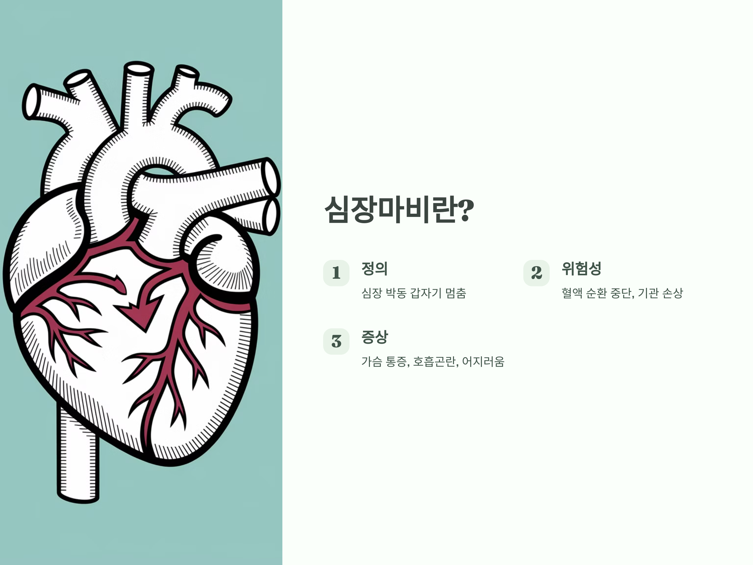 심장마비는 심장이 갑작스럽게 멈추거나 정상적인 박동을 하지 않게 되는 상태를 말합니다. 심장은 우리 몸에 혈액을 순환시키는 중요한 역할을 하는데, 이 기능이 멈추면 산소와 영양분이 충분히 공급되지 않아 각종 기관에 심각한 피해를 입힐 수 있습니다. 심장마비가 발생하면, 혈액 순환이 멈추므로 호흡이 곤란해지고, 의식을 잃을 수 있습니다.