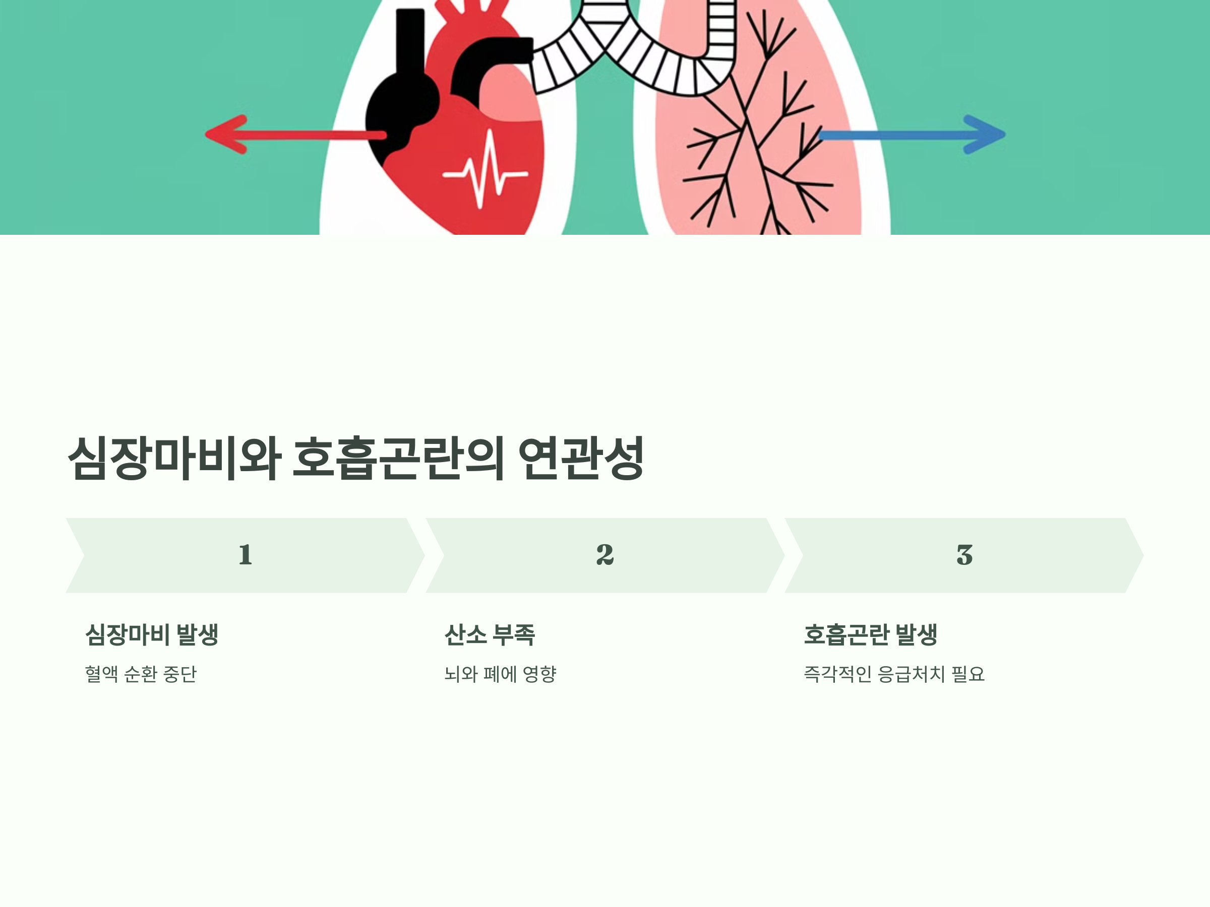 심장마비가 발생하면 심장이 멈추거나 비정상적으로 뛰게 되어 혈액이 제대로 순환하지 않게 됩니다. 이로 인해 뇌와 폐에 산소 공급이 부족해져 호흡곤란이 발생합니다. 이러한 상황에서 혈액순환이 정상화되지 않으면, 뇌와 심장이 기능을 하지 않게 되어 더 심각한 상태에 이를 수 있습니다. 심장마비와 호흡곤란은 동시에 발생할 수 있으며, 이러한 증상이 나타날 경우 즉시 응급처치를 해야 합니다.