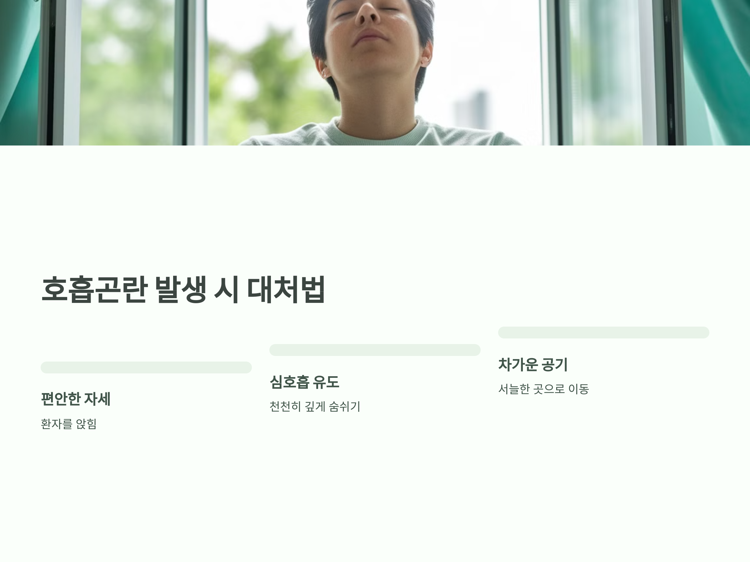 - 차가운 공기 마시기: 환자가 차가운 공기를 마시면 호흡이 쉬워질 수 있습니다. 특히 여름철에는 차가운 물을 마시거나 서늘한 곳으로 이동하도록 도와주세요.