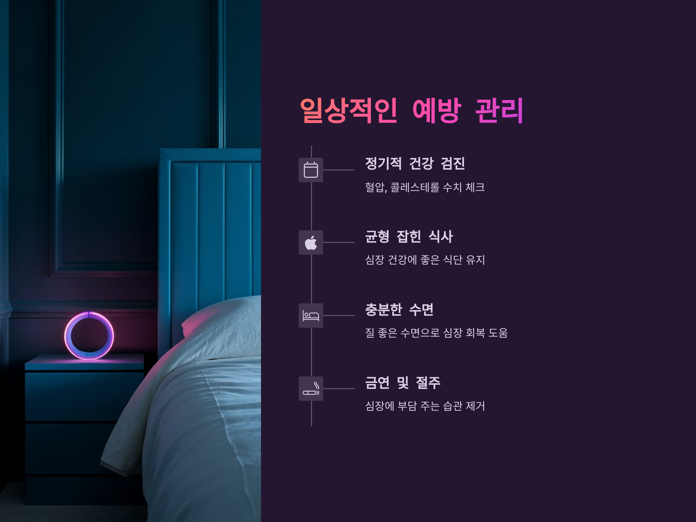 둘째, 심장 건강을 위한 올바른 생활습관을 유지하는 것이 핵심입니다. 이를 위해 균형 잡힌 식사, 꾸준한 운동, 충분한 수면을 유지하며, 음주와 흡연을 피해야 합니다. 이러한 습관들은 심장뿐만 아니라 전체적인 건강에도 긍정적인 영향을 미칩니다. 마지막으로, 스트레스 관리와 정신적인 건강도 부정맥을 예방하는 데 중요한 요소입니다.
