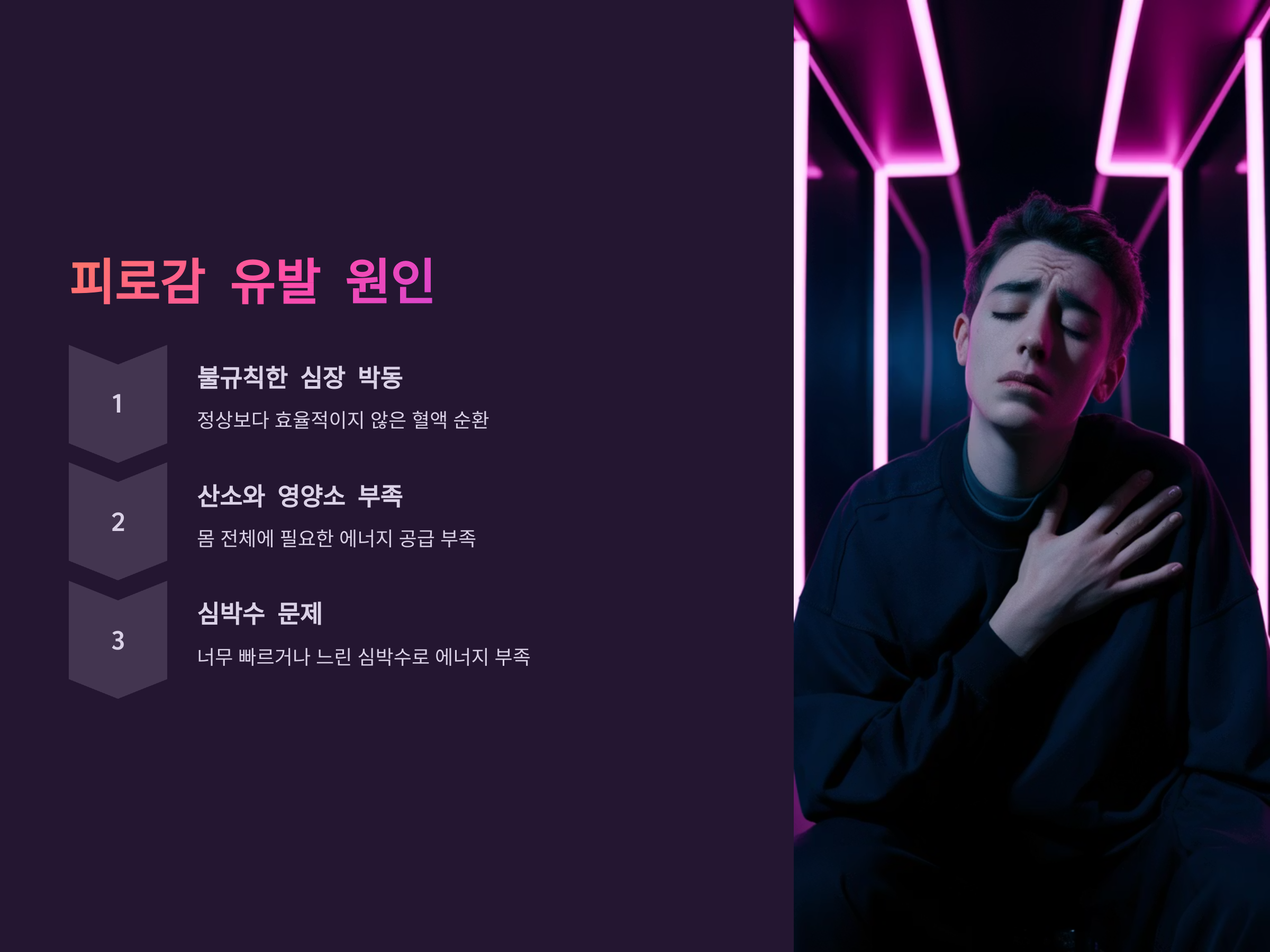 부정맥이 발생할 경우, 심장이 충분히 혈액을 펌프질하지 못하므로 몸의 각 부위로 산소와 영양분을 공급하는 데 어려움이 생깁니다. 이로 인해 피로감, 숨 가쁨, 현기증, 심한 경우에는 의식 소실이나 심장마비까지 초래할 수 있습니다. 특히, 부정맥에 의해 심장의 혈액 순환이 저해되면 몸은 자연스럽게 더 많은 에너지를 소모하게 되어 피로감을 더욱 느끼게 됩니다.
