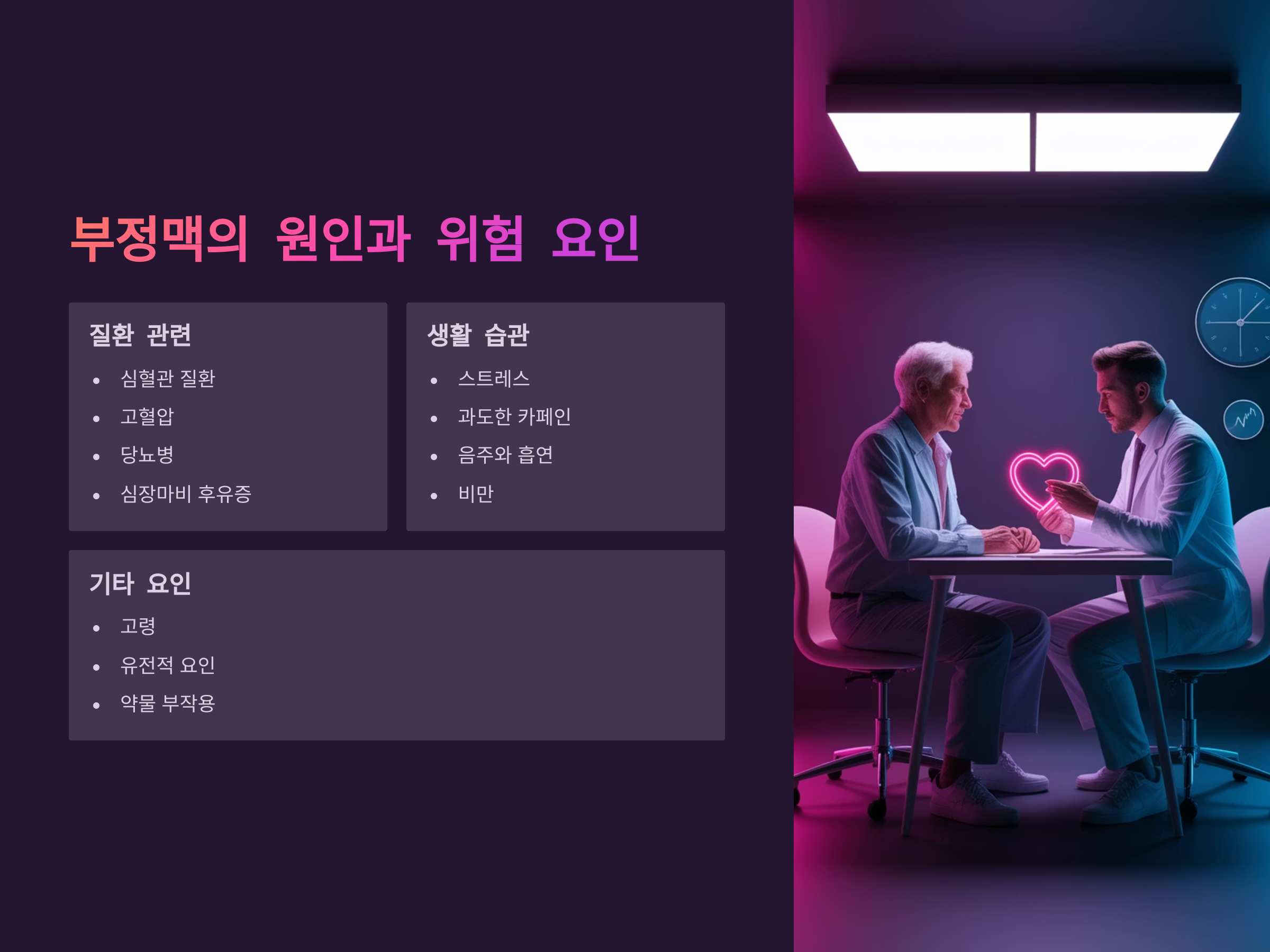 심장 부정맥은 다양한 원인으로 발생할 수 있습니다. 가장 흔한 원인으로는 심혈관 질환, 고혈압, 당뇨병, 심장 마비 후유증 등이 있습니다. 이 외에도 스트레스, 과도한 카페인 섭취, 음주, 흡연, 비만 등이 부정맥을 유발할 수 있습니다. 또한, 나이가 많을수록 부정맥이 발생할 확률이 높아지며, 일부 유전적인 요인도 관련이 있을 수 있습니다.