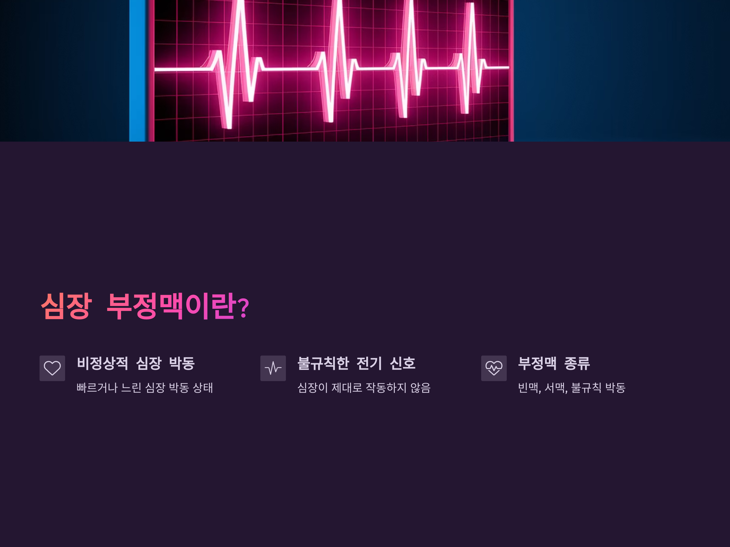 심장 부정맥은 심장의 박동이 비정상적으로 빠르거나 느려지는 상태를 말합니다. 이는 심장에 전해지는 전기 신호가 불규칙적으로 발생하면서 심장이 제대로 작동하지 않게 만듭니다. 심장은 일정한 리듬으로 박동해야 하지만 부정맥이 발생하면 혈액이 제대로 순환하지 않아 피로감을 느끼게 됩니다. 부정맥의 종류에는 심박수가 너무 빠른 ‘빈맥’, 심박수가 너무 느린 ‘서맥’, 그리고 심장이 불규칙하게 뛰는 ‘부정맥’ 등이 있습니다.
