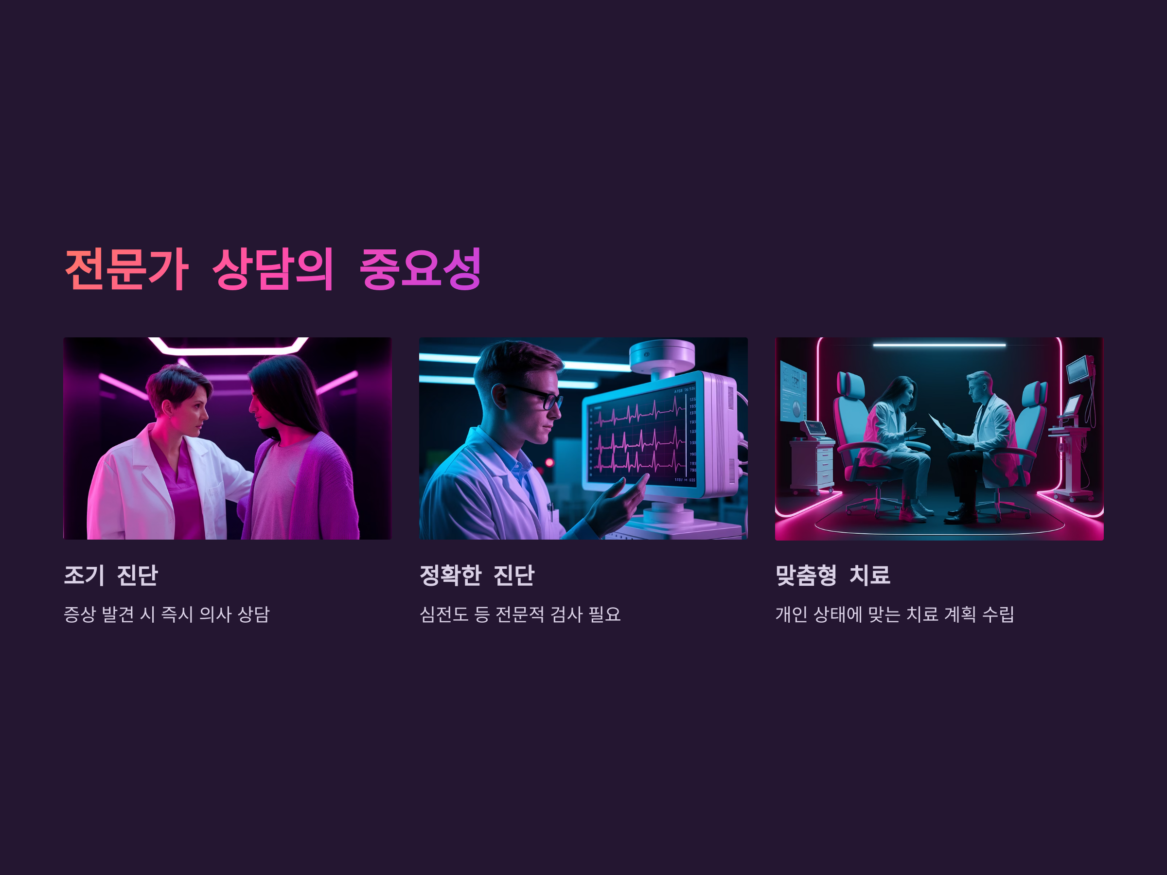 특히, 심장 부정맥은 피로감뿐만 아니라 생명을 위협할 수 있는 심각한 증상으로 이어질 수 있기 때문에, 이를 방치해서는 안 됩니다. 부정맥이 의심되거나 피로감이 지속되면 반드시 전문가의 상담을 받는 것이 중요합니다.