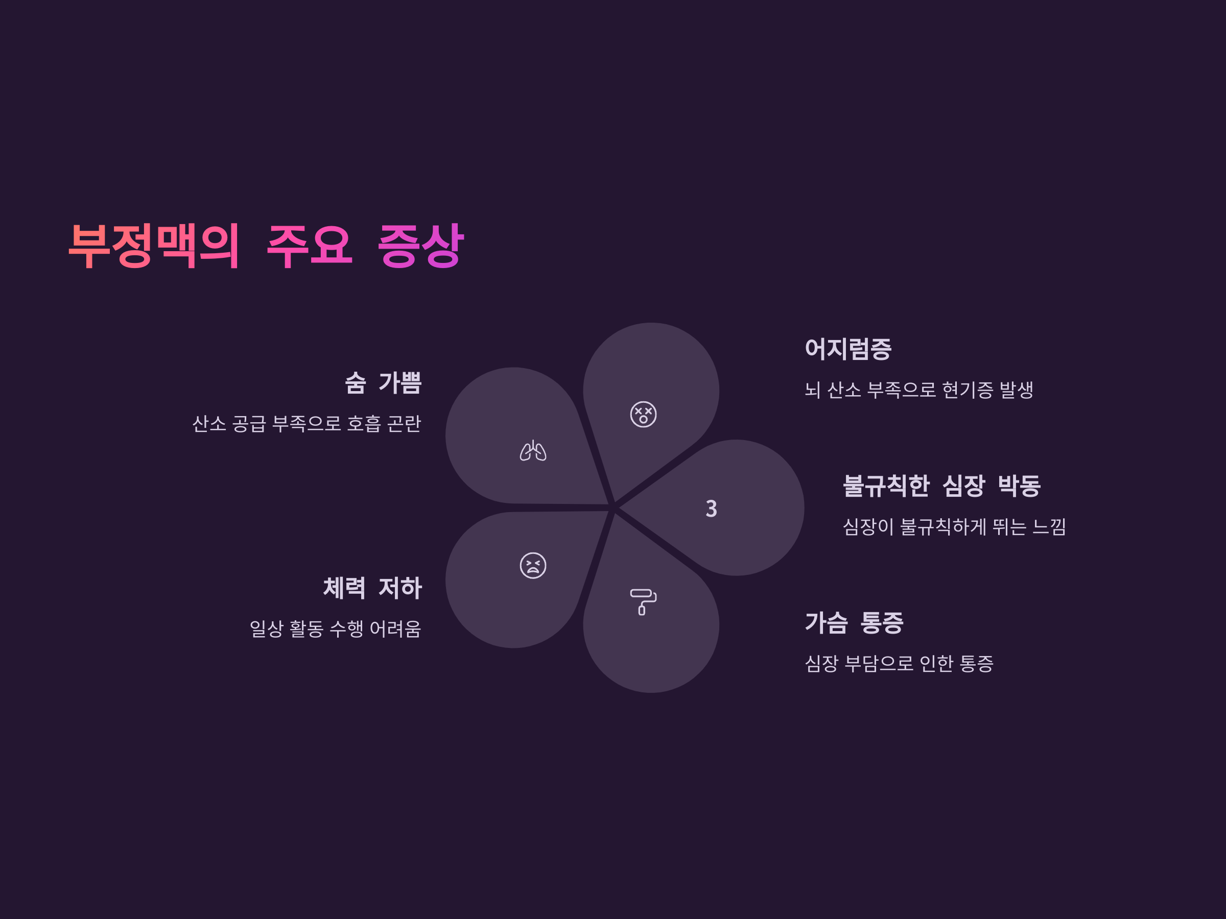 - 불규칙한 심장 박동: 자신의 심장 박동이 불규칙하게 느껴질 수 있습니다. 이는 부정맥의 대표적인 증상 중 하나입니다.