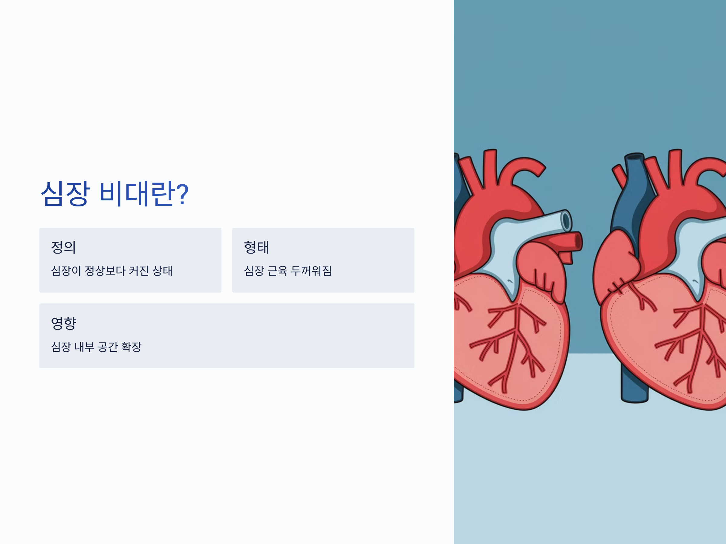 심장 비대란 심장이 정상 크기보다 커진 상태를 말합니다. 이는 심장 근육이 두꺼워지거나 심장 내부 공간이 확장되어 발생할 수 있습니다. 이러한 변화는 심장의 기능에 영향을 미쳐 다양한 증상을 초래할 수 있습니다. citeturn0search3